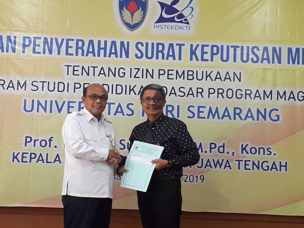 Universitas PGRI Semarang (UPGRIS) kembali menambah satu prodi baru yakni Program Magister Pendidikan Dasar yang SK nya diserahkan oleh Kepala LLDIKTI Wilayah VI, Prof. Dr. DYP. Sugiharto kepada rektor UPGRIS Dr. Muhdi baru-baru ini.