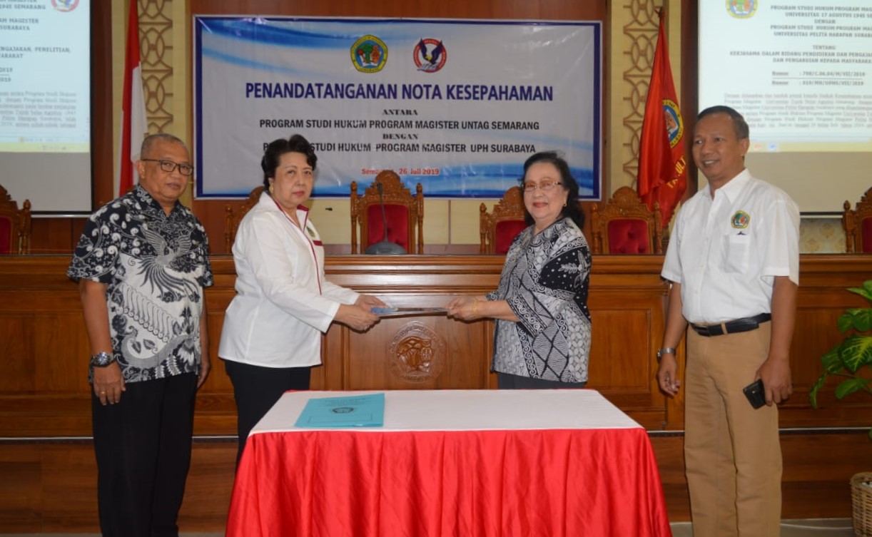 Untuk meningkatkan Tridharma Perguruan Tinggi (PT) yakni pendidikan, penelitian dan pengabdian kepada masyarakat, maka Program Studi Hukum Program Magister (PHPM) Untag Semarang telah menjalin kerjasama dengan PHPM Universitas Pelita Harapan (UPH) Surabaya.