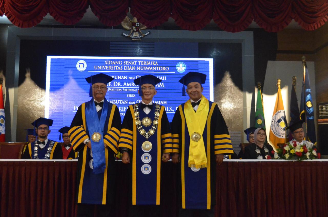 Sementara itu, rektor UDINUS Prof. Dr. Edi Noersasongko pada kesempatan tersebut menuturkan bahwa saat ini lembaganya tambah dua Profesor, yakni Prof. Dr. Amron sebagai Profesor bidang ilmu Ekonomi Manajemen, serta Prof. Ir. Zainal Arifin Hasibuan, MLS, Ph.D yang akrab disapa Ucok sebagai Profesor bidang ilmu Komputer.