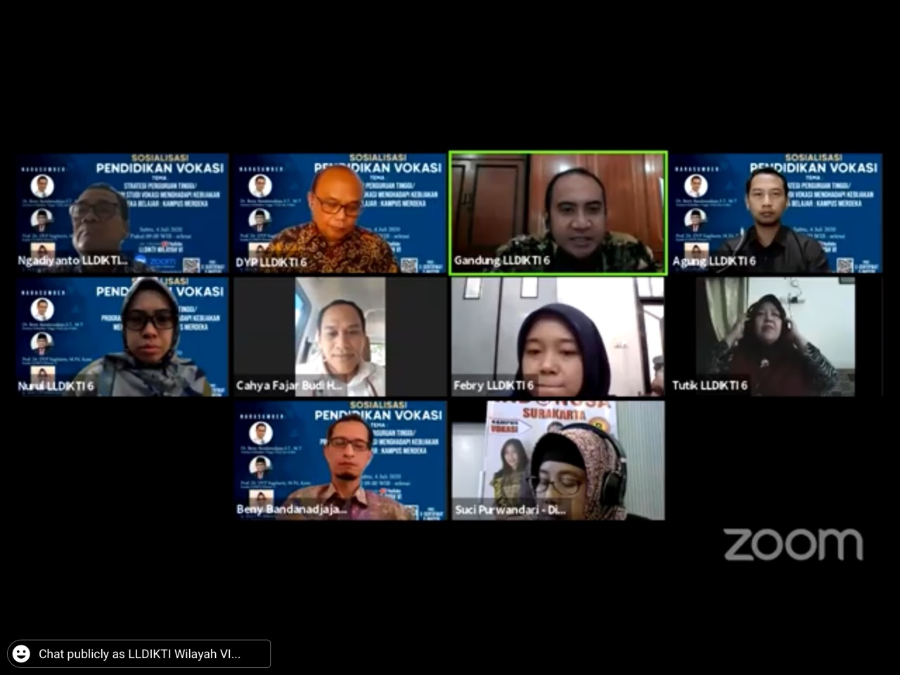 Kegiatan yang mengusung tema Strategi Perguruan Tinggi/ Program Studi Vokasi menghadapi kebijakan Merdeka Belajar: Kampus Merdeka ini, mengundang Dr Beny Bandanadjaja MT, Direktur Pendidikan Tinggi Vokasi dan Profesi, dan Ir Suci Purwandari MM, Direktur Politeknik Indonusa Surakarta sebagai narasumber.