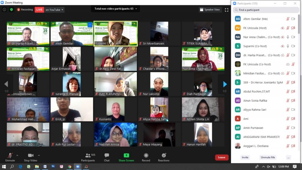 Lebih dari 100 orang dari berbagai profesi mulai dari ibu rumah tangga, mahasiswa, guru, dosen, dokter dan dokter spesialis dari berbagai kota di Indonesia mengikuti kegiatan webinar tersebut melalui aplikasi zoom dan lebih dari 60 orang menyaksikan acara tersebut di kanal YouTube ICT FKUNISSULA.