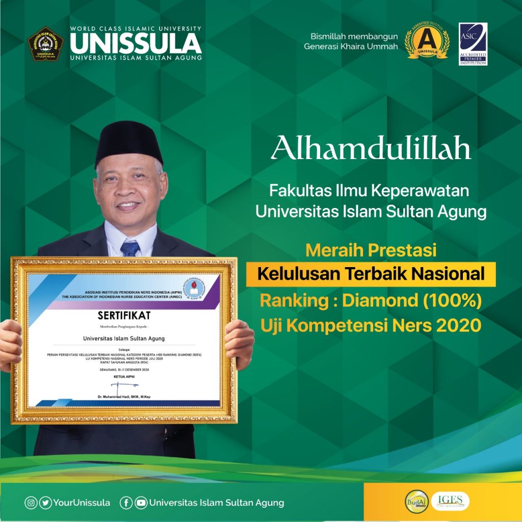 Fakultas Ilmu Keperawatan Unissula berhasil meraih prestasi kelulusan terbaik nasional dalam uji kompetensi nasional uji kompetensi ners 2020. Penghargaan tersebut diberikan pada the 19th AINEC annual meeting and international seminar yang dilaksanakan di Semarang (10-11/12). Acara tersebut merupakan acara yang selalu ditunggu karena merupakan award yang paling bergengsi di perguruan tinggi Keperawatan. Adapun uji kompetensi dilaksanakan bulan Juli 2020.