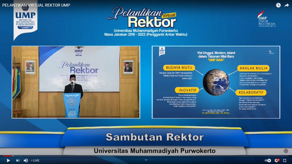 Rektor terpilih, Dr Jebul Suroso dalam sambutannya menyampaikan harapan dapat membangun kampus UMP menjadi kampus yang berbudaya mutu, inovatif, berakhlak mulia, dan kolaboratif, sehingga dapat menghasilkan buah karya produk dan kebijakan yang nantinya bisa bermanfaat bukan hanya untuk keluarga UMP melainkan untuk masyarakat dan keluarga persyarikatan dan manusia secara umum.