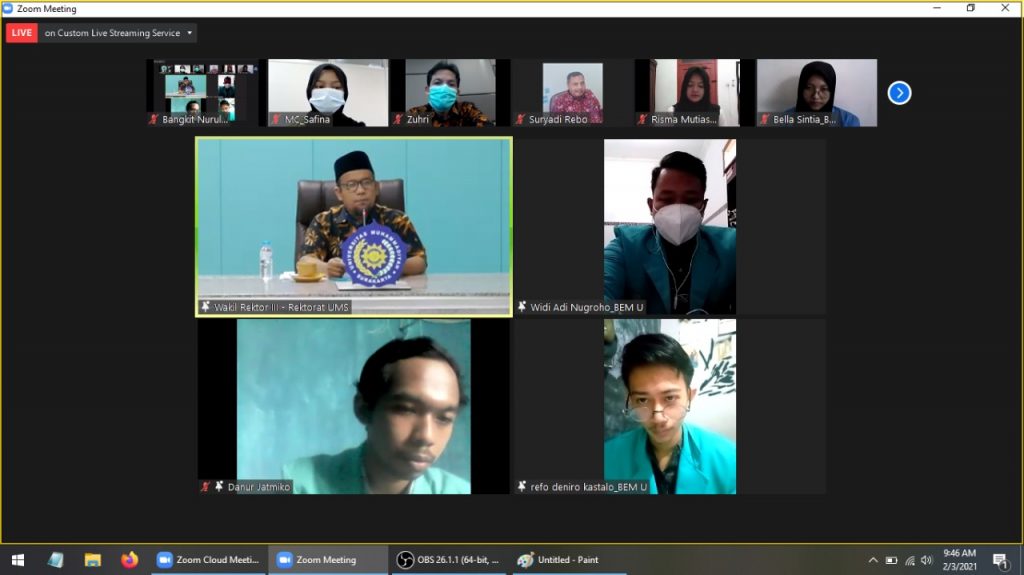 Taufik mengatakan, ini adalah kali pertama pelantikan pimpinan BEM dan DPM UMS yang dilaksanakan secara online. Menurutnya hal ini dilakukan agar kita semua tetap bisa mematuhi protokol kesehatan.