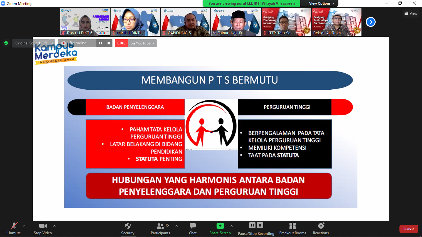 “Di dalamnya memberikan otonomi kewenangan pengelolaan Perguruan Tinggi, saya tidak lelah untuk mengingatkan hal ini. Apabila semua siap, pada bulan Februari 2022 ijinkan LLDIKTI Wilayah VI mengingatkan Diktu Ketiga ini,” tambah Prof Zain.