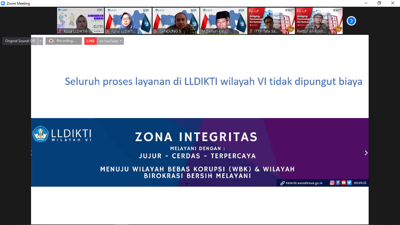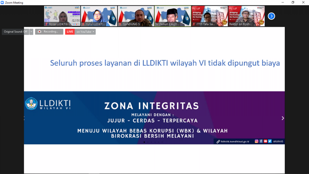 Pada kesempatan tersebut Prof Zain juga menerangkan bahwa LLDIKTI Wilayah VI mencanangkan Zona Integritas. “LLDIKTI Wilayah VI masuk ke dalam Lembaga yang diusulkan dalam ZI, kalau ada staf LLDIKTI atau saya yang meminta sesuatu langsung laporkan,” tegas Prof Zain. Hal ini menandai bahwa LLDIKTI Wilayah VI menjadi Lembaga yang beritegritas dan siap melayani para pemangku kepentingan sesuai dengan Amanah peraturan perundangan.