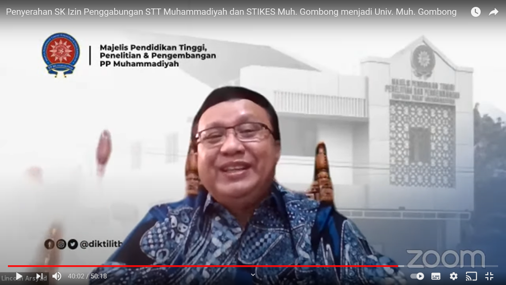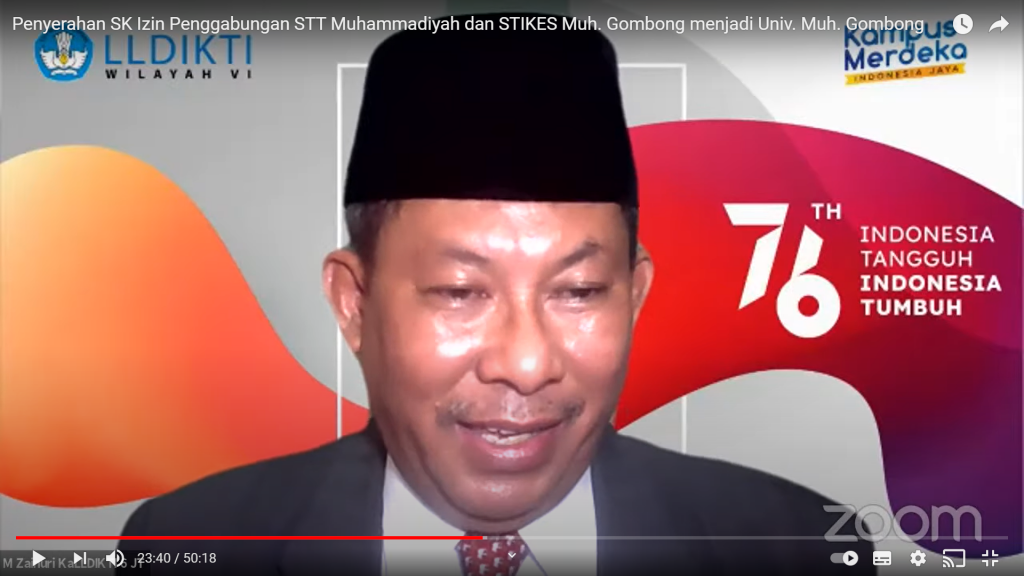 Prof Dr Muhammad Zainuri DEA, Kepala LLDIKTI Wilayah VI, menyerahkan salinan surat keputusan tersebut kepada Ketua BPH Universitas Muhammadiyah Gombong, dr Fatah Widodo SPm MKes secara daring. Tampak hadir dalam penyerahan tersebut Ketua Majelis Diktilitbang PP Muhammadiyah, Prof Lincolin Arsyad, juga jajaran dari LLDIKTI Wilayah VI.