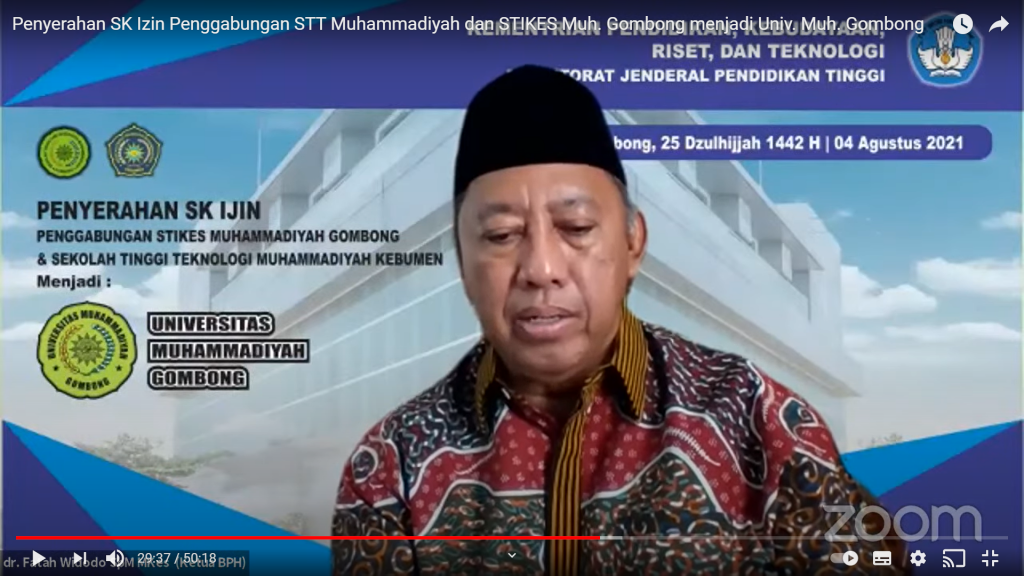 “Tidak lelah saya mengingatkan, di dalam SK tersebut ada diktum kelima, butir A dan butir B. Bapak dan Ibu harus siap untuk segera menyelesaikan migrasi data agar nanti kalau menyelenggarakan rekruitmen mahasiswa di akhir bulan Agustus atau September, maka semua data labelnya harus sudah Universitas Muhammadiyah Gombong. Nanti awal bulan Febuari 2022, dimohon untuk semua data pembelajaran selama satu semester harus sudah lengkap masuk ke PD-Dikti, supaya kami bisa segera mengevaluasi implementasi dari surat putusan ini.” tutupnya.