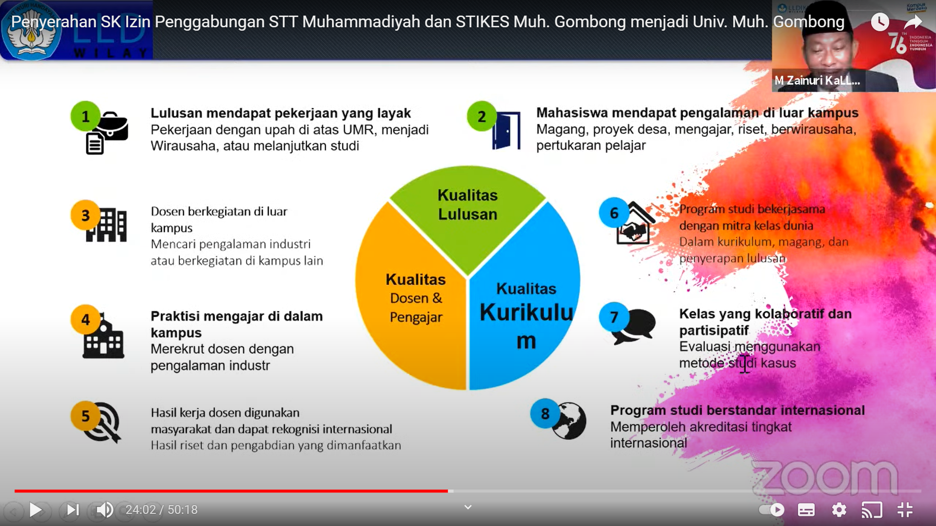 Dalam arahannya, Prof. Zain juga menegaskan tranformasi pendidikan tinggi melalui 8 Indikator Kinerja Utama (IKU) dimana beberapa poin diantaranya menjadi indikator penting yang ditekankan, yaitu pada butir 6 dan butir 8. Beliau juga menegaskan tentang sistem baru yang dirancang kementrian tentang penjaminan mutu internal untuk peningkatan akreditasi dalam konteks penerapan 8 indikator kinerja Merdeka Belajar Kampus Merdeka.