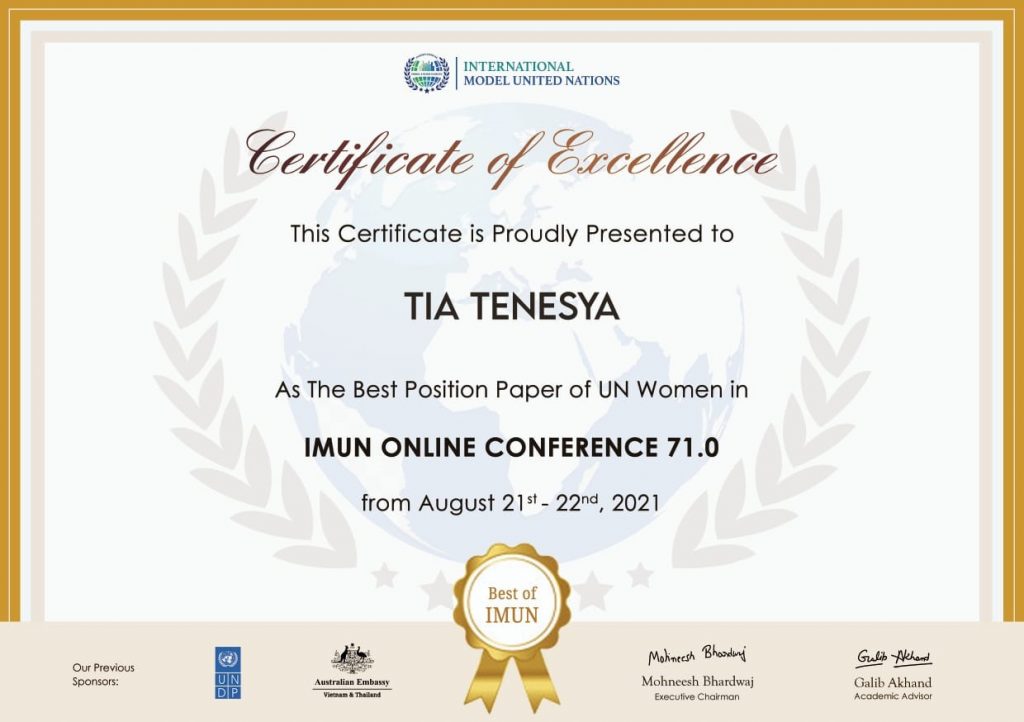 Sekali lagi prestasi bertaraf internasional diraih oleh 2 Mahasiswi Sastra Inggris Fakultas Bahasa dan Budaya Universitas AKI. Tia Tenesya, mahasiswi semester 5, meraih penghargaan sebagai The Best Position Paper pada gelaran konferensi internasional yang diselenggarakan oleh International Model United Nation (IMUN) pada Sabtu dan Minggu (21-22/8).  Dalam kegiatan yang dilaksanakan secara online ini, Tia mewakili suara dari Vietnam dengan komitenya, yaitu UN Women. Topik yang diangkat adalah Ensuring Gender Equality by Alleviating Discrimination Against Women. Konferensi Internasional yang ini dilaksanakan secara dari melalui aplikasi Zoom dan  diikuti oleh delegasi dari 140 negara dan kemudian dibagi menjadi beberapa komite seperti WHO, UN Women, UNICEF, UNDP, UNEDP dan SOCHUM.  Peserta konferensi IMUN, yang dikenal sebagai delegasi,  ditempatkan di komite dan ditugaskan untuk mengangkat isu pada suatu negara. Tia harus bertarung melawan beberapa peserta dari berbagai negara untuk menyuarakan aspirasi negara yang diwakili. Atas usahanya Tia menjadi satu-satunya yang mendapat penghargaan The Best Position Paper setelah menyisihkan peserta lain.