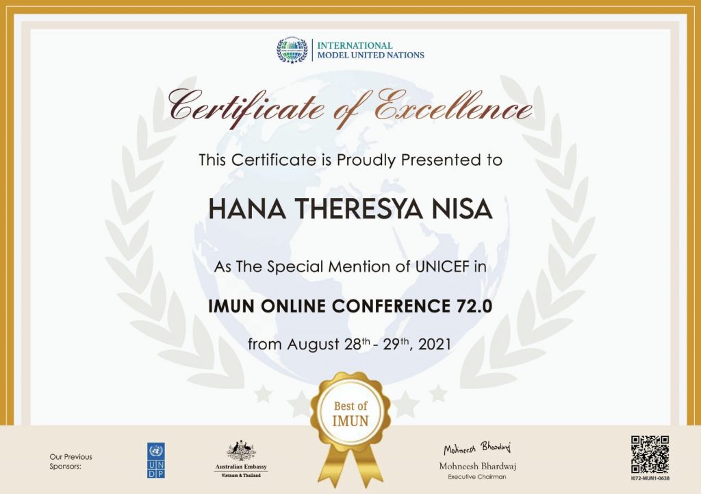 Tak kalah membanggakan adalah prestasi mahasiswi Sastra Inggris lain yang ditorehkan oleh Hana Teresya Nisa, mahasiswa semester 7, yang mendapatkan penghargaan sebagai The Special Mentionpada konferensi IMUN pada Sabtu dan Minggu (28-29/8). Hana, dengan komitenya yaitu UNICEF, membahas topik Saving the children: Putting an end to child marriage and teenage pregnancy.The Special Mentionadalah penghargaan sebagai delegasi terbaik kedua dalam menyampaikan aspirasi dari suatu negara, yang pada kesempatan kali ini Hana mewakili negara Latvia. Pada konferensi ini, peserta harus aktif menyampaikan speech, menjawab pertanyaan, menyampaikan pendapat, bernegosiasi, dan berdebat. Karena harus bersaing dengan peserta dari berbagai negara, maka peserta harus memiliki kemampuan seperti penelitian, menulis jurnal, berbicara di depan umum, negosiasi, debat, serta kemampuan komunikasiDengan semua bekal yang telah diperoleh selama masa perkuliahan, maka akhirnya Hana dapat menyisihkan puluhan peserta yang berasal dari berbagai negara dengan perolehan penghargaan sebagai The Special Mention.