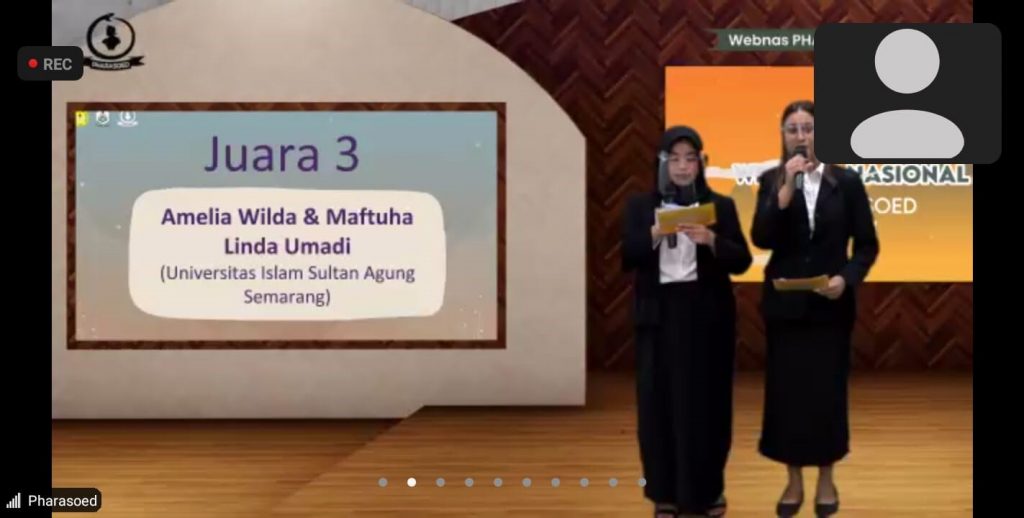 Mahasiswa Prodi Farmasi Fakultas Kedokteran Unissula Amelia Wilda dan Maftuha Linda Umadi berhasil meraih juara III cabang lomba Poster Pharmacy of Soedirman Competition (Pharasoed) VI 2021.