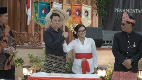 Rektor Universitas Kristen Satya Wacana (UKSW) Prof. Dr. Intiyas Utami, S.E., M.Si., Ak., dan Dekan Fakultas Sains dan Matematika Dr. Wahyu Hari Kristiyanto, S.Pd., M.Pd. saat menandatangani komitmen kerja.