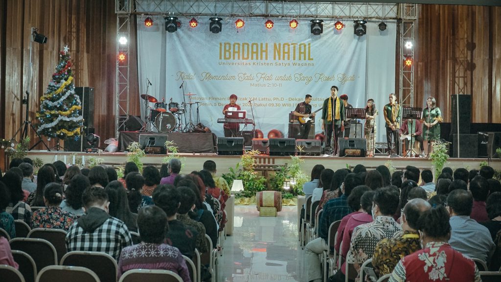 Minggu kerja baru di lingkungan Universitas Kristen Satya Wacana (UKSW) dibuka dengan kegiatan Ibadah Natal yang diselenggarakan di Balairung Universitas, Senin (5/12/2022) pagi. Tema ibadah natal di UKSW tahun ini adalah “Natal : Momentum Satu Hati untuk Sang Kasih Sejati” yang diambil dari nats Alkitab Matius 2: 10-11. Dekan Fakultas Teologi Pdt. Izak Y.M. Lattu, Ph.D., berkesempatan untuk membawakan Firman Tuhan dalam ibadah yang diikuti oleh Pimpinan Universitas, pejabat fakultas, dosen, tenaga kependidikan dan juga mahasiswa ini.