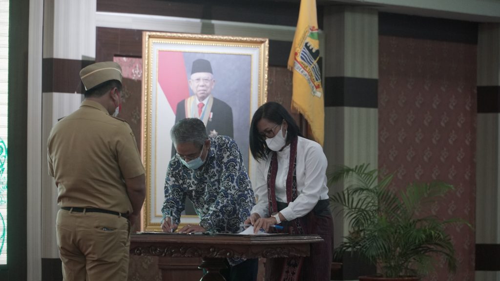 Rektor Universitas Kristen Satya Wacana (UKSW) Prof. Dr. Intiyas Utami, S.E., M.Si., Ak., dan Wakil Gubernur Jawa Tengah H. Taj Yasin Maimoen menandatangani kesepakatan bersama antara UKSW dengan Pemerintah Provinsi Jawa Tengah; tentang Penyelenggaraan Pemerintahan, Pembangunan dan Kemasyarakatan melalui Kegiatan Tri Dharma Perguruan Tinggi di Jawa Tengah, Senin (19/12/2022) sore di Gedung Gradhika Bhakti Praja, Semarang. Penandatanganan kesepakatan bersama tersebut dirangkai dengan kegiatan Penerimaan Anugerah Pemetaan Daya Saing Daerah (PDSD) Provinsi Jawa Tengah Tahun 2022, hasil kerja sama antara Pemerintah Provinsi Jawa Tengah dengan Badan Riset dan Inovasi Daerah (BRIDA), Badan Riset dan Inovasi Nasional (BRIN).