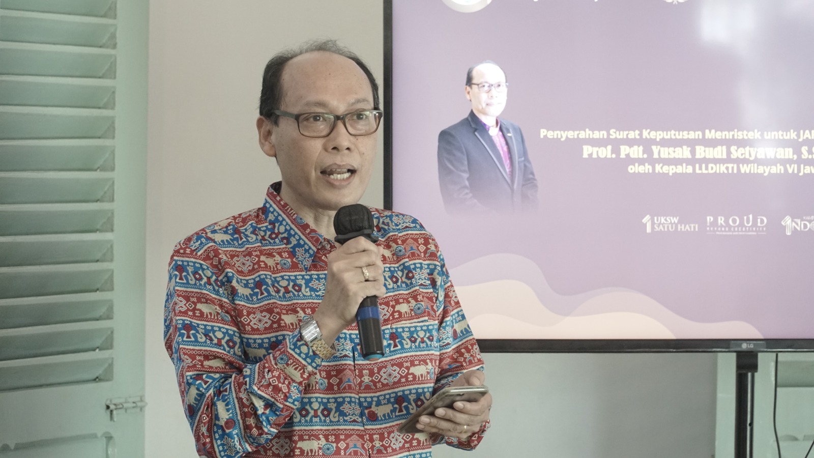 Guru Besar di lingkungan Universitas Kristen Satya Wacana (UKSW) resmi bertambah. Hal ini ditandai dengan penyerahan Surat Keputusan (SK) Kementerian Pendidikan, Kebudayaan, Riset dan Teknologi (Kemendikbudristek) untuk Jabatan Fungsional Akademik (JAFA) Guru Besar atas nama Prof. Pdt. Yusak Budi Setyawan, S.Si., MATS., Ph.D., Kamis (04/05/2023) siang di Rumah Noto UKSW. Dengan SK ini, Prof. Pdt. Yusak resmi menyandang gelar Guru Besar dalam Bidang Ilmu Agama Kristen dan Teologia.
