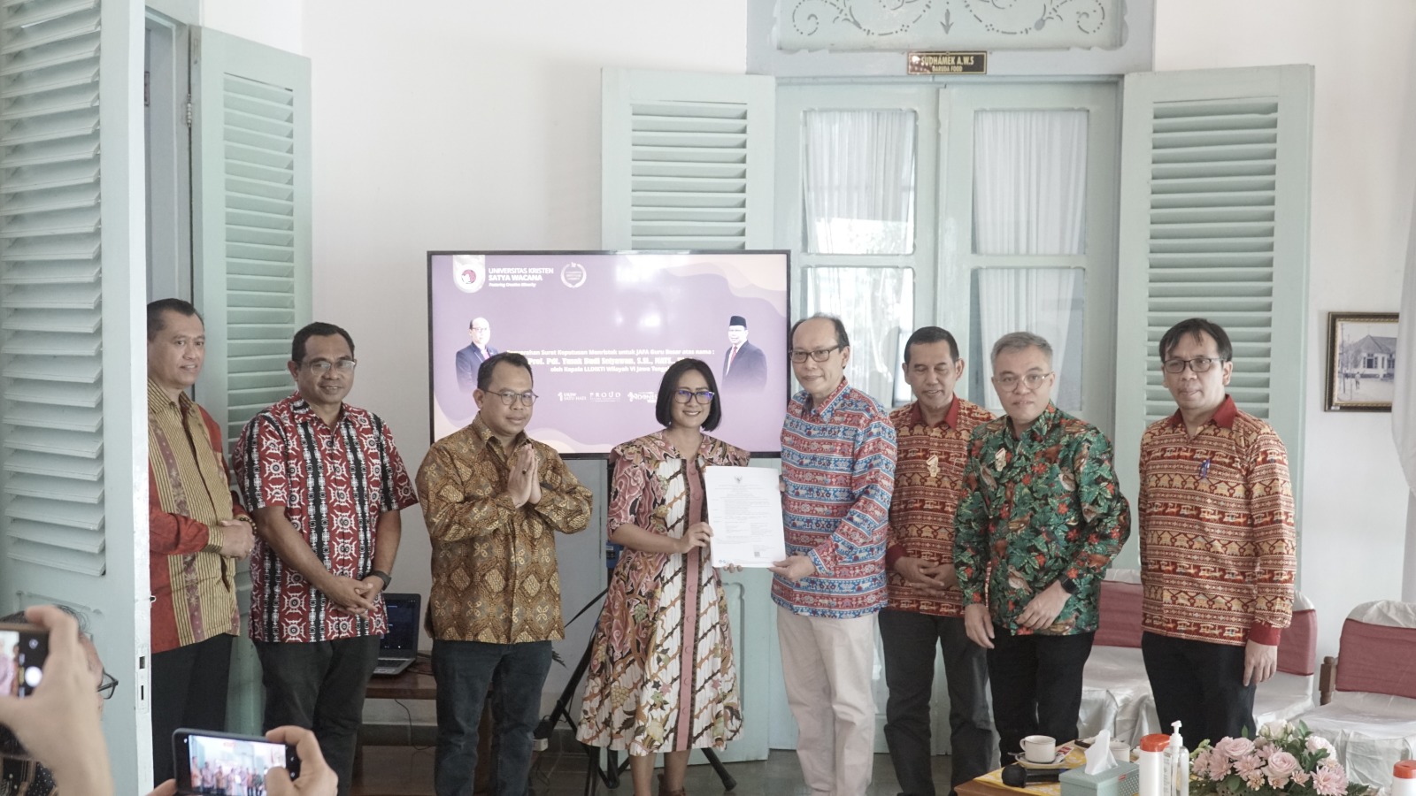 SK diberikan langsung oleh Kepala Lembaga Layanan Pendidikan Tinggi (LLDIKTI) Wilayah VI Bhimo Widyo Andoko, S.H., M.H., kepada Rektor UKSW Prof. Intiyas Utami, S.E., M.Si., Ak., yang kemudian diserahkan kepada Prof. Pdt. Yusak Budi Setyawan, S.Si., MATS., Ph.D. Acara penyerahan SK hari ini dihadiri para Wakil Rektor UKSW, Sekretaris Pengurus Yayasan Perguruan Tinggi Kristen Satya Wacana (YPTKSW), Senator UKSW dan juga sejumlah direktur direktorat di UKSW.
