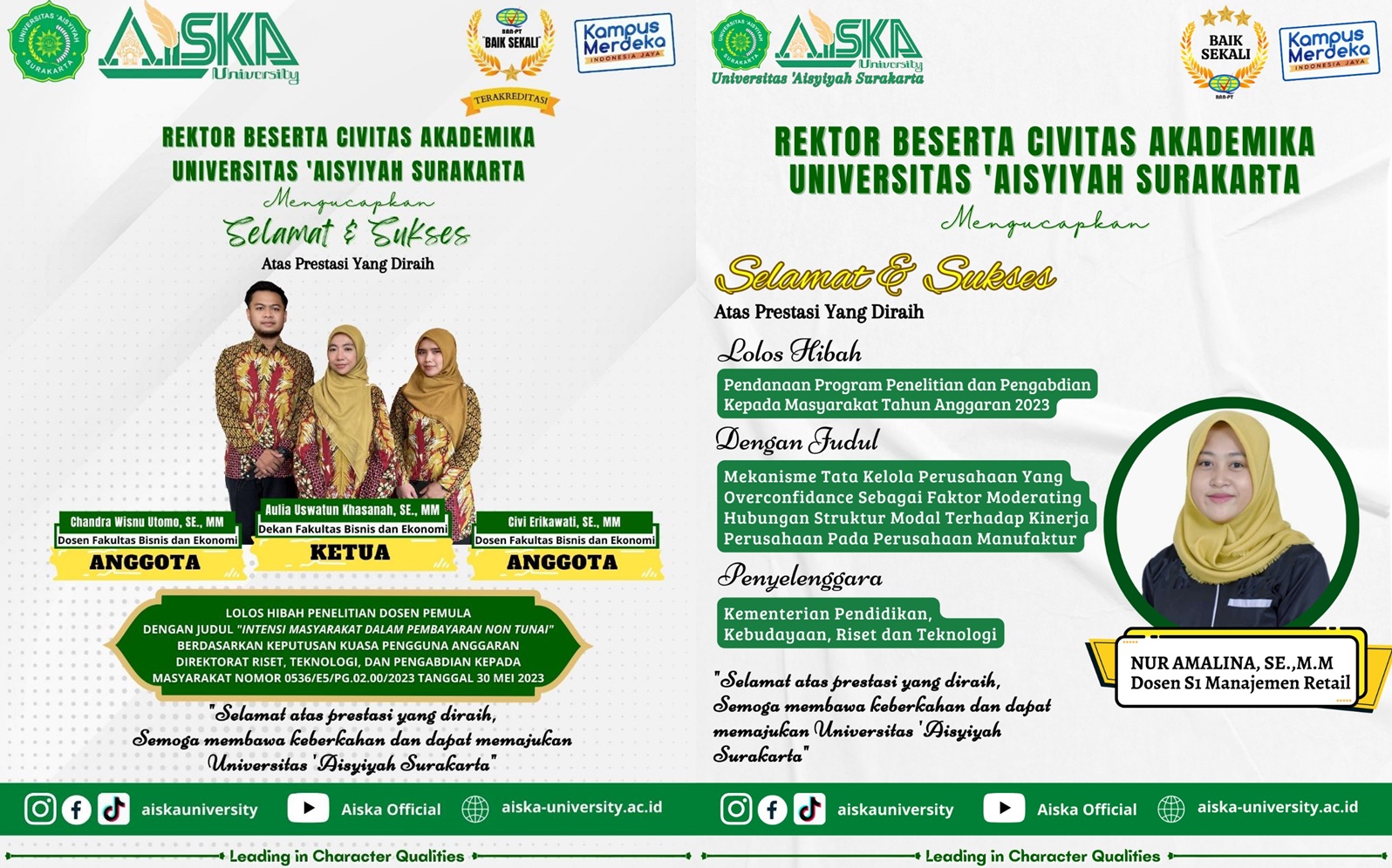 Selain Tim Dosen tersebut, Ibu Nur Amalina, S.E., M.M., dosen FBE AISKA, dengan penelitiannya yang berjudul “Mekanisme Tata Kelola Perusahaan yang Overconfidence sebagai Faktor Moderating Hubungan Struktur Modal terhadap Kinerja Perusahaan pada Perusahaan Manufaktur”, juga berhasil berhasil mendapatkan Hibah Penelitian Dosen Pemula (PDP) 2023.
