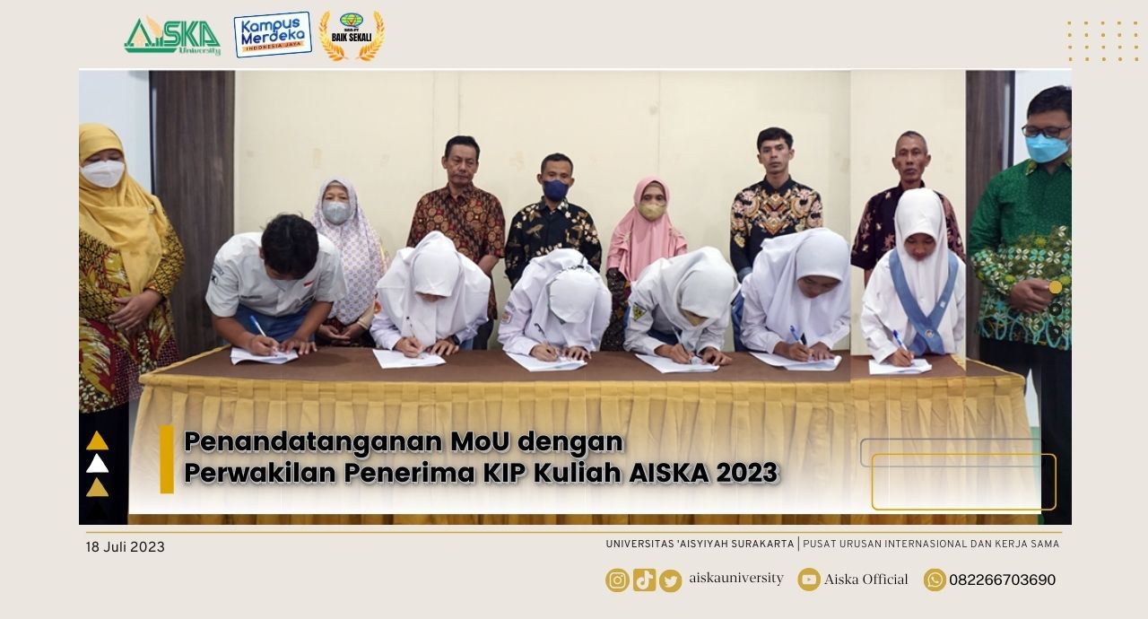 AISKA, Surakarta – Setelah hampir 1 (satu) bulan melakukan rentetan seleksi, Universitas ‘Aisyiyah Surakarta (AISKA) mengumumkan hasil seleksi akhir KIP (Kartu Indonesia Pintar) Kuliah 2023 beberapa waktu yang lalu. Sebagai bentuk seremonial dari pemberian beasiswa KIP Kuliah tersebut, Universitas ‘Aisyiyah Surakarta melangsungkan kegiatan penandatanganan Memorandum of Understanding (MoU) dengan perwakilan mahasiswa penerima beasiswa KIP Kuliah 2023 pada hari Selasa (18/7) di Ruang Aula Kampus 2 Universitas ‘Aisyiyah Surakarta. Penandatanganan MoU ini dihadiri oleh perwakilan mahasiswa penerima beasiswa yang didampingi oleh orang tua serta wali mereka.