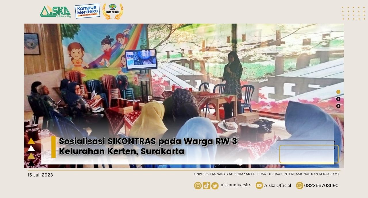 AISKA, Surakarta – Program Studi (prodi) Sistem dan Teknologi Informasi (STI), Fakultas Sains dan Teknologi (FST), Universitas ‘Aisyiyah Surakarta (AISKA) melangsungkan kegiatan sosialisasi SIKONTRAS (Sistem Informasi Kontrasepsi Rasional) di daerah Kerten, Laweyan, Surakarta pada hari Sabtu (15/7) lalu. Acara ini digelar di Balai RW 3 Kelurahan Kerten, Surakarta dengan jumlah peserta yang hadir sekitar 21 orang. Peserta yang hadir merupakan anggota PKK RW 3 Kelurahan Kerten, yang sebagian besar terdiri dari para wanita yang sudah menikah dan beberapa yang belum menikah. Kegiatan ini merupakan salah satu bentuk pengabdian kepada masyarakat yang dilaksanakan oleh para dosen prodi STI AISKA.
