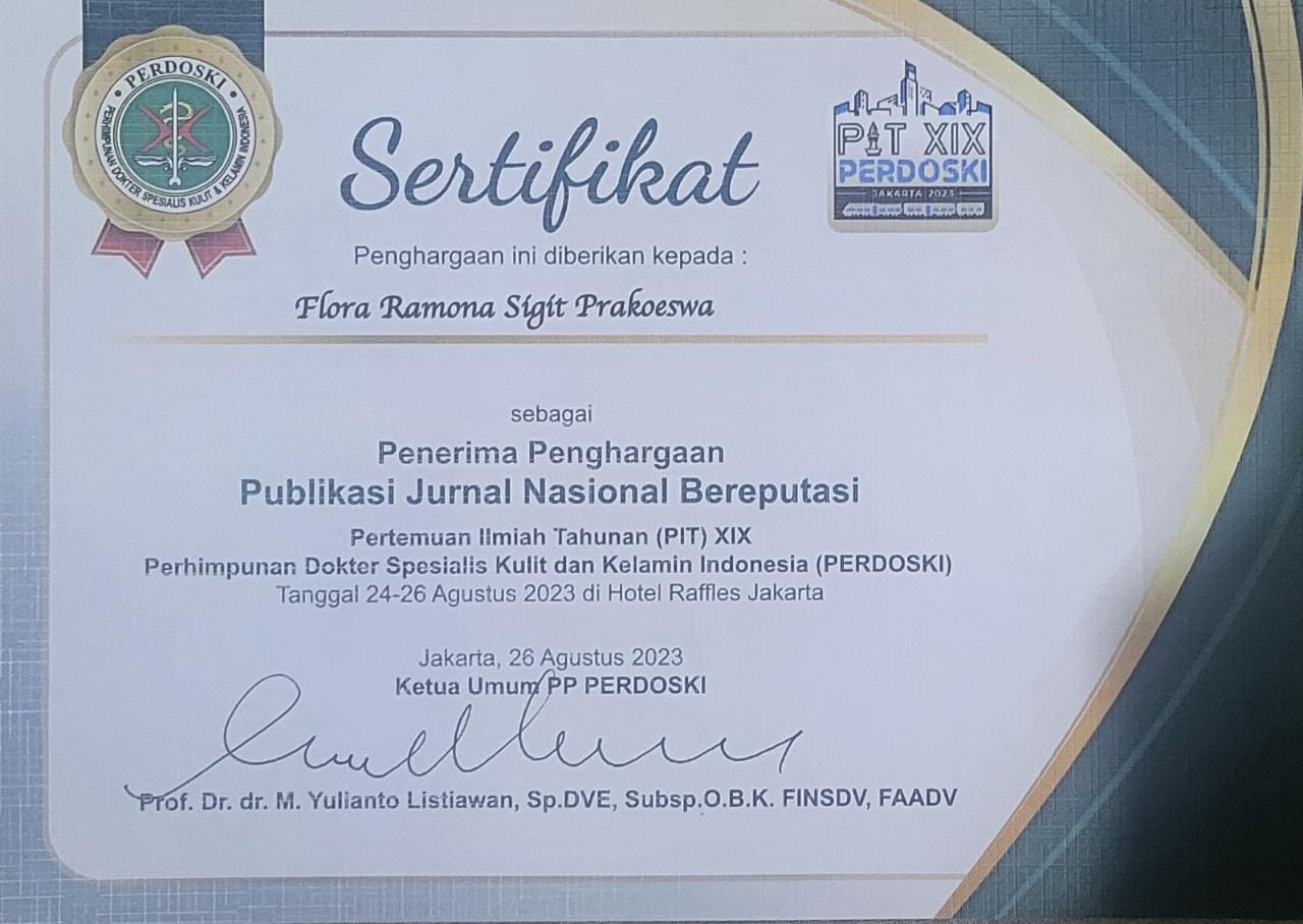 Penganugerahan tersebut diberikan dalam kegiatan Pertemuan Ilmiah Tahunan (PIT) XIX Perhimpunan Dokter Spesialis Kulit dan Kelamin (PERDOSKI) pada tanggal 24-26 Agustus 2023 lalu, di hotel Raffles Jakarta.