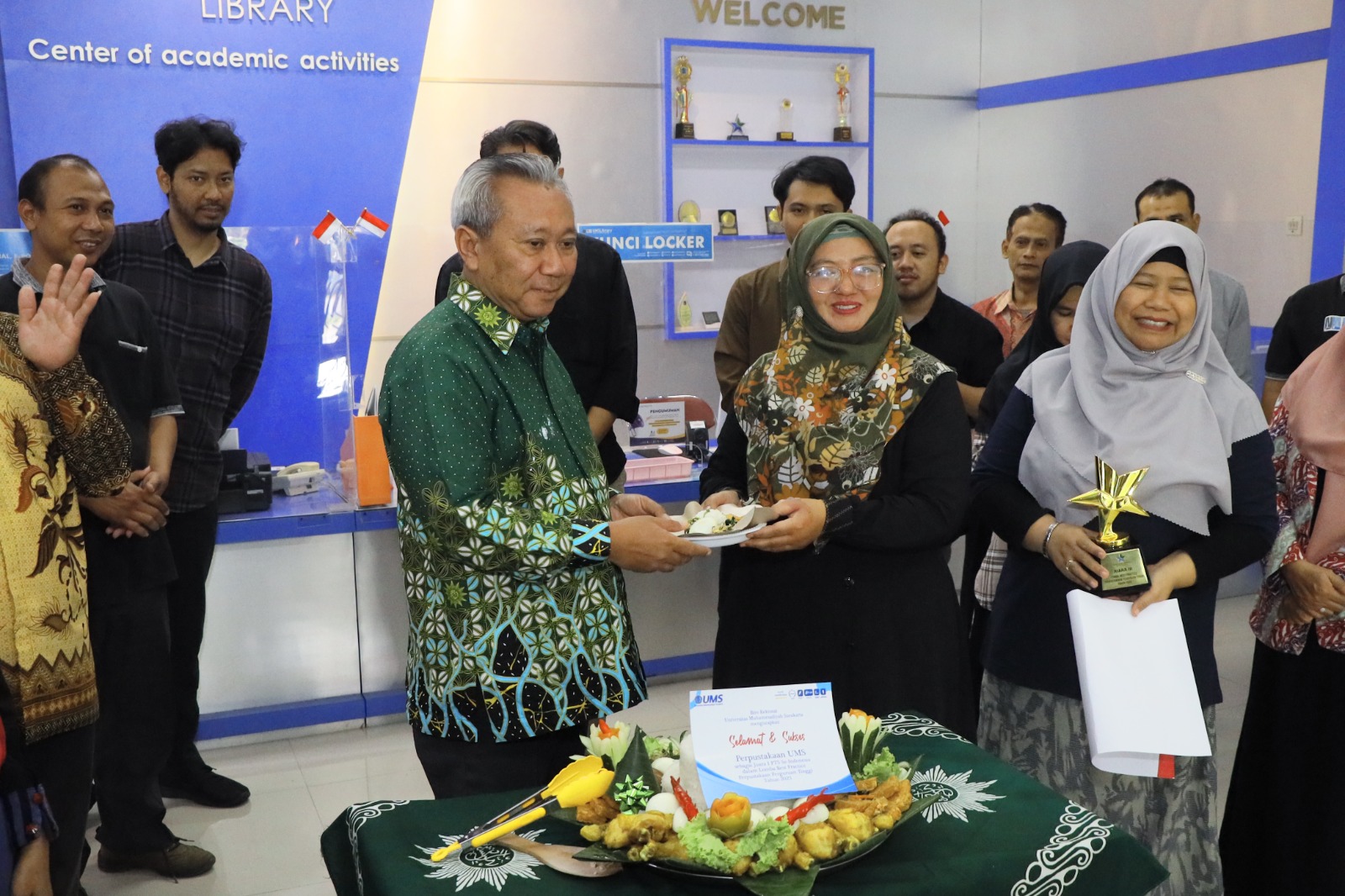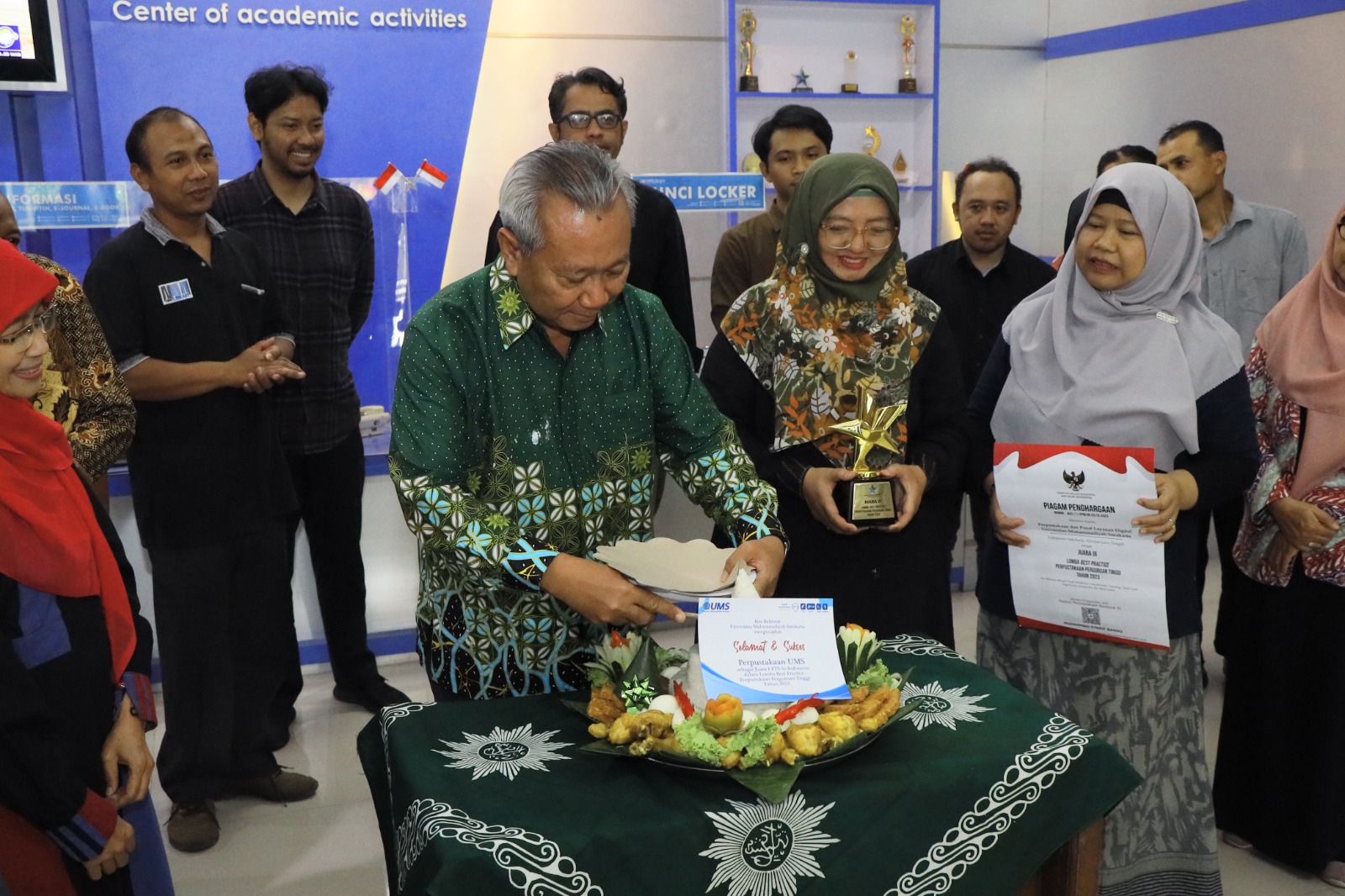 “Pokoknya besok adalah, sebagai bentuk apresiasi kami untuk rekan-rekan supaya lebih semangat lagi,” pungkas Rektor UMS itu. Sebagai tanda syukur, Rektor UMS mewujudkan dengan pemotongan tumpeng dan mengajak semua karyawan Perpustakaan UMS makan bersama.