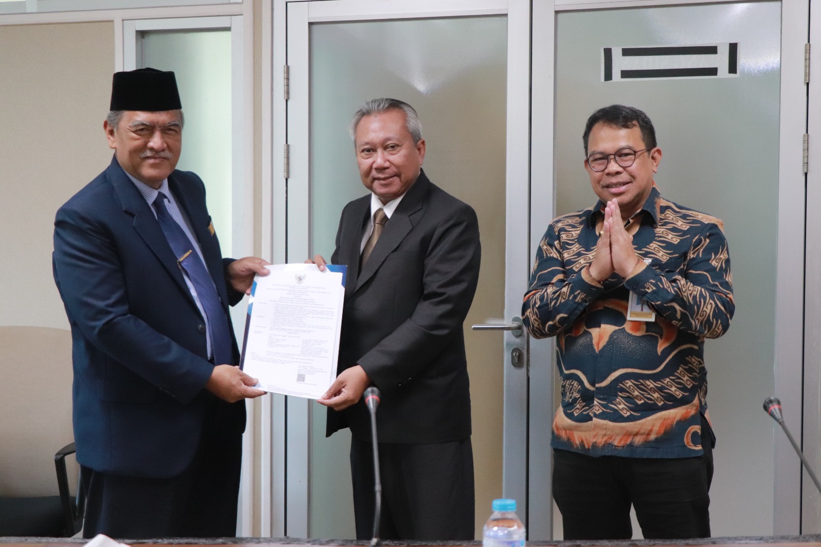 Penyerahan ini dilaksanakan pada, Jumat, (22/9) di ruang sidang BPH lt. 6 Gedung Induk Siti Walidah kepada dua guru besar, Prof., Dr., Sabar Narimo, M.M., M.Pd., dan Prof., Waluyo Adi Siswanto, Ph.D yang diwakili Dekan Fakultas Teknik UMS, Rois Fatoni, Ph.D. Saat penyerahan Prof., Waluyo masih berada di Malaysia.