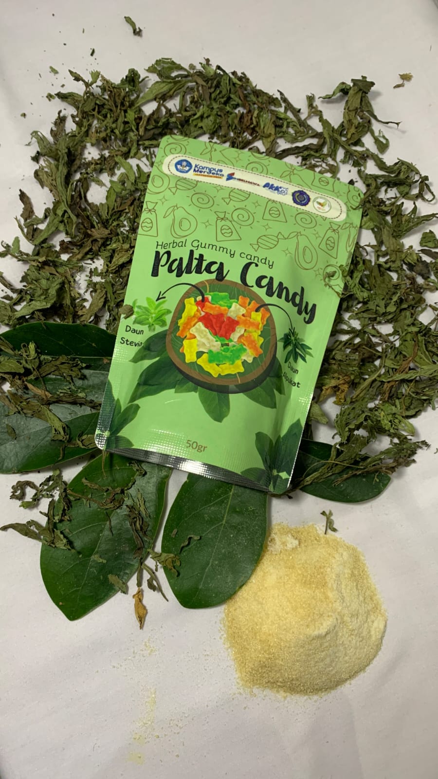 Palta Candy terbuat dari bahan dasar ekstrak daun alpukat dan daun stevia yang digelatinisasi dengan gelatin sapi supaya mengental, sehingga terbentuk gummy candy. Produk ini merupakan herbal yang diinovasi dalam bentuk permen, dengan sasaran anak anak penderita epilepsi dan demam.