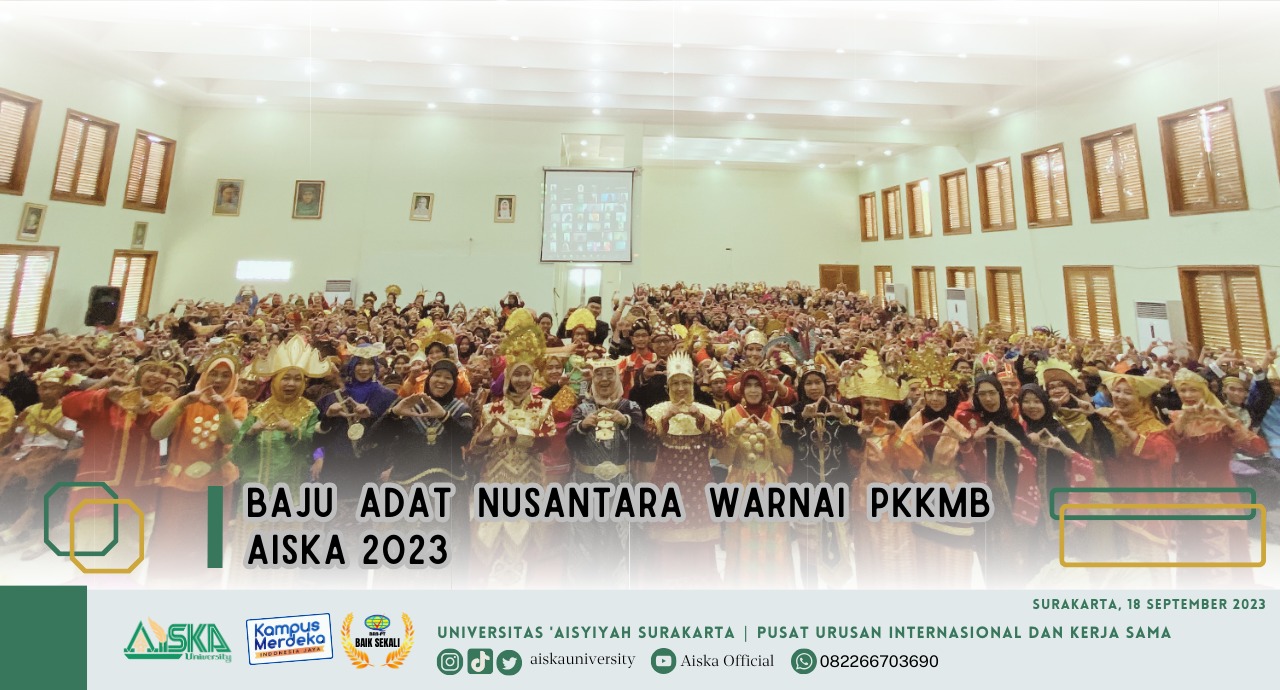 Surakarta – Universitas ‘Aisyiyah Surakarta (AISKA) menggelar kegiatan Pengenalan Kehidupan Kampus bagi Mahasiswa Baru (PKKMB) Tahun Akademik (TA) 2023/2024. Mengusung tema “Mewujudkan Generasi Unggul, Inovatif, Kompetitif dan Berbudaya Menuju Kampus Merdeka Belajar”, kegiatan PKKMB ini dilaksanakan selama empat hari, Senin-kamis (18-16/09/2023). Ada 4 kata kunci yang dijadikan tema PKKMB tahun ini generasi unggul yang memiliki makna generasi yang memiliki kecerdasan dan karakter yang baik dan memberikan dampak bagi diri sendiri, sesama dan lingkungannya, inovatif memiliki makna kemampuan menciptakan ide-ide baru, kompetitif memiliki makna menjadi mahasiswa yang memiliki nilai tambah, kelebihan dan keunggulan dibanding mahasiswa lain serta berbudaya seseorang yang menguasai dan berperilaku sesuai dengan nilai-nilai budaya. Corak berbudaya salah satu yang nampak dalam kegiatan PKKMB adalah beragam baju adat yang dipakai. Beraneka ragam baju adat dari Nusantara mewarnai gelaran Pengenalan Kehidupan Kampus bagi Mahasiswa Baru (PKKMB) Universitas ‘Aisyiyah Surakarta (AISKA) tahun 2023. Tak hanya mahasiswa baru, namun segenap jajaran pimpinan dan panitia penyelenggara pun ikut meramaikan PKKMB dengan mengenakan baju adat di Indonesia.