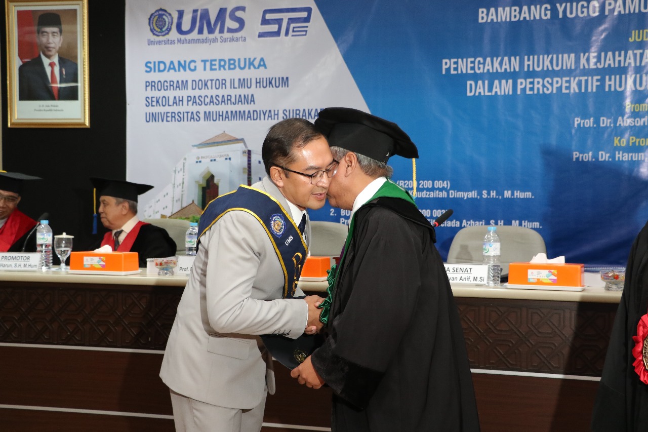 PABELAN – Kapolresta Denpasar Kombes Pol., Dr., Bambang Yugo Pamungkas, SH., SiK.,M.Si., resmi menyandang gelar Doktor setelah menyelesaikan Sidang Terbuka dan dinyatakan lulus dari Program Doktor Ilmu Hukum (PDIH) Universitas Muhammadiyah Surakarta (UMS), Kamis (5/10) di Ruang Seminar Pascasarjana UMS.