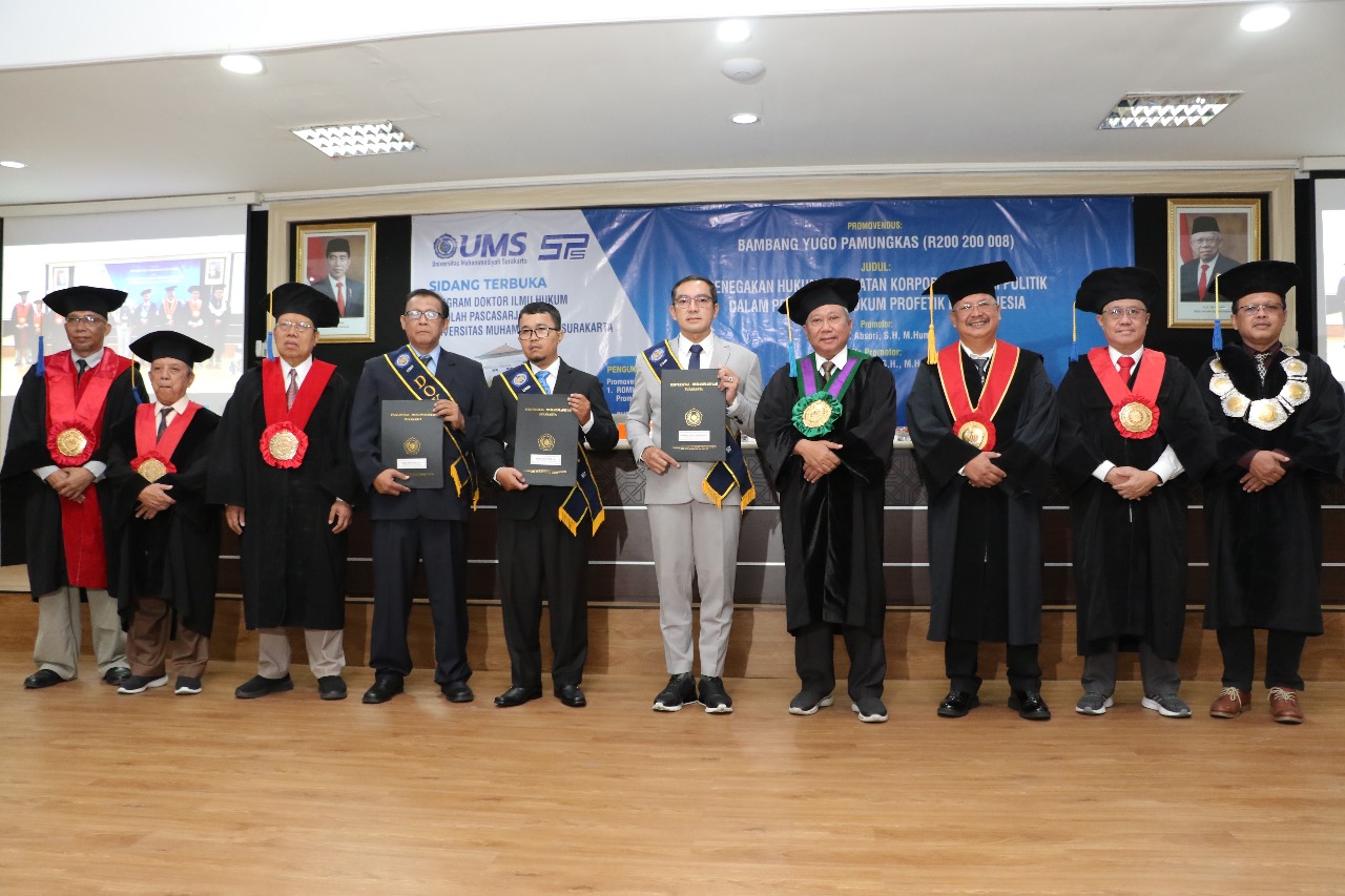 Selain itu, juga dikukuhkan sebagai Doktor Ilmu Hukum UMS atas nama dan Dr., Romi Saputra, SH., MH., menjadi Doktor Ilmu Hukum ke-73 dan Dr., Budi Santoso, M.Si., menjadi Doktor Ilmu Hukum ke-74.
