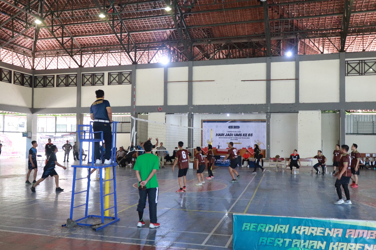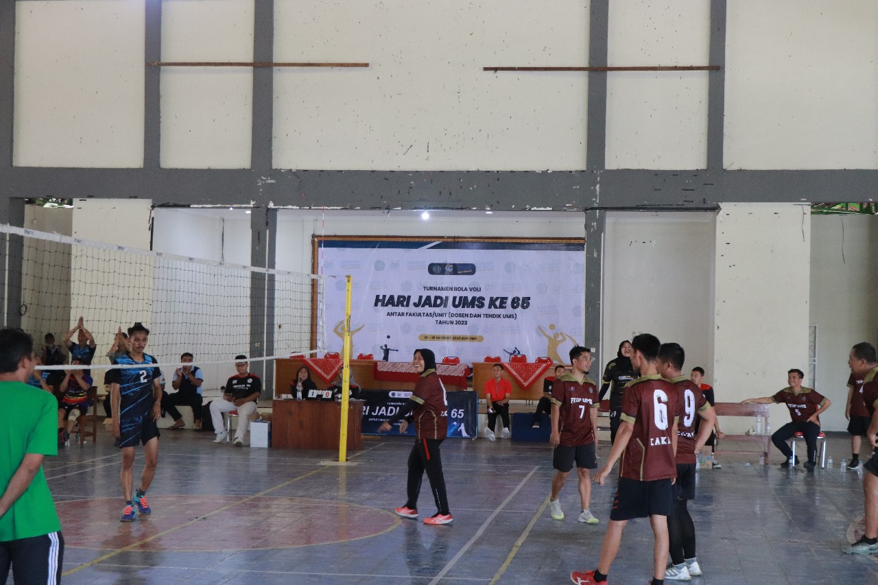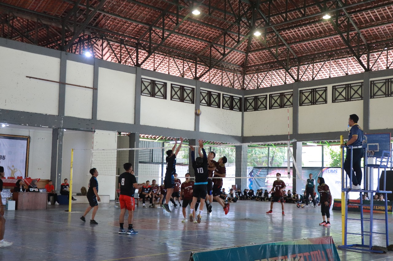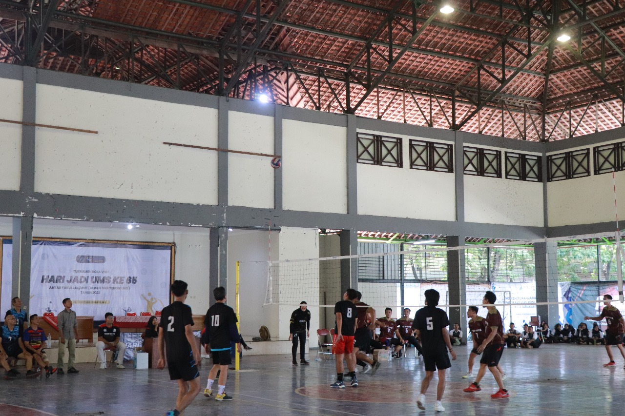 PABELAN – Dalam rangka menyambut Milad ke-65, Universitas Muhammadiyah Surakarta (UMS) menggelar Pertandingan Bola Voli antar dosen maupun tenaga kependidikan, Selasa, (17/10) yang berlokasi di GOR Kampus 2 UMS. Pertandingan ini merupakan salah satu cabang olahraga pada rangkaian Milad ke-65 UMS, yang diikuti oleh 16 tim dari dosen dan tenaga kependidikan (tendik) UMS.