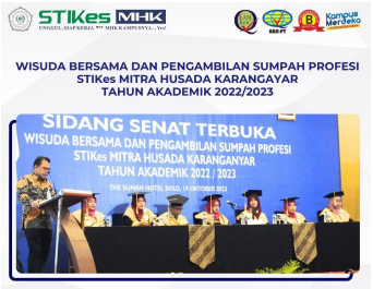 Hari Kamis, Tanggal 19 Oktober 2023 STIKes Mitra Husada Karanganyar menggelar Wisuda Bersama Prodi D3 Kebidanan, D3 Rekam Medis dan Informasi Kesehatan, Diploma 4 Manajemen Informasi Kesehatan, Sarjana Keperawatan di The Sunan Hotel Solo yang diikuti 207 wisudawan/ti dalam sambutan Bapak Bhimo Widyo Andoko, SH ,MH selaku Kepala LLDIKTI Wilayah VI Jawa Tengah disampaikan bahwa Wisudawan/ti untuk kuliah lagi, jadilah tenaga kesehatan yang terus mau belajar seiring berkembangnya teknologi yang semakin canggih dan harus berinovasi dengan memanfaatkan teknologi bidang kesehatan yang lebih baik lagi. Serta berpesan STIKes Mitra Husada Karanganyar untuk segera berkembang menjadi Universitas. Kegiatan tersebut dihadiri pula Kepala Dinas Pendidikan dan Kebudayaan Kabupaten Karanganyar, Stakeholder, Mitra kerja dan semua civitas STIKes Mitra Husada Karanganyar. Dilanjutkan pemberian pengarahan kepada wisudawan/ti terbaik 1.2,3 dan wisudawan/ti berprestasi dari tiap program studi. Diakhiri hiburan dari Paduan swara Stimada.
