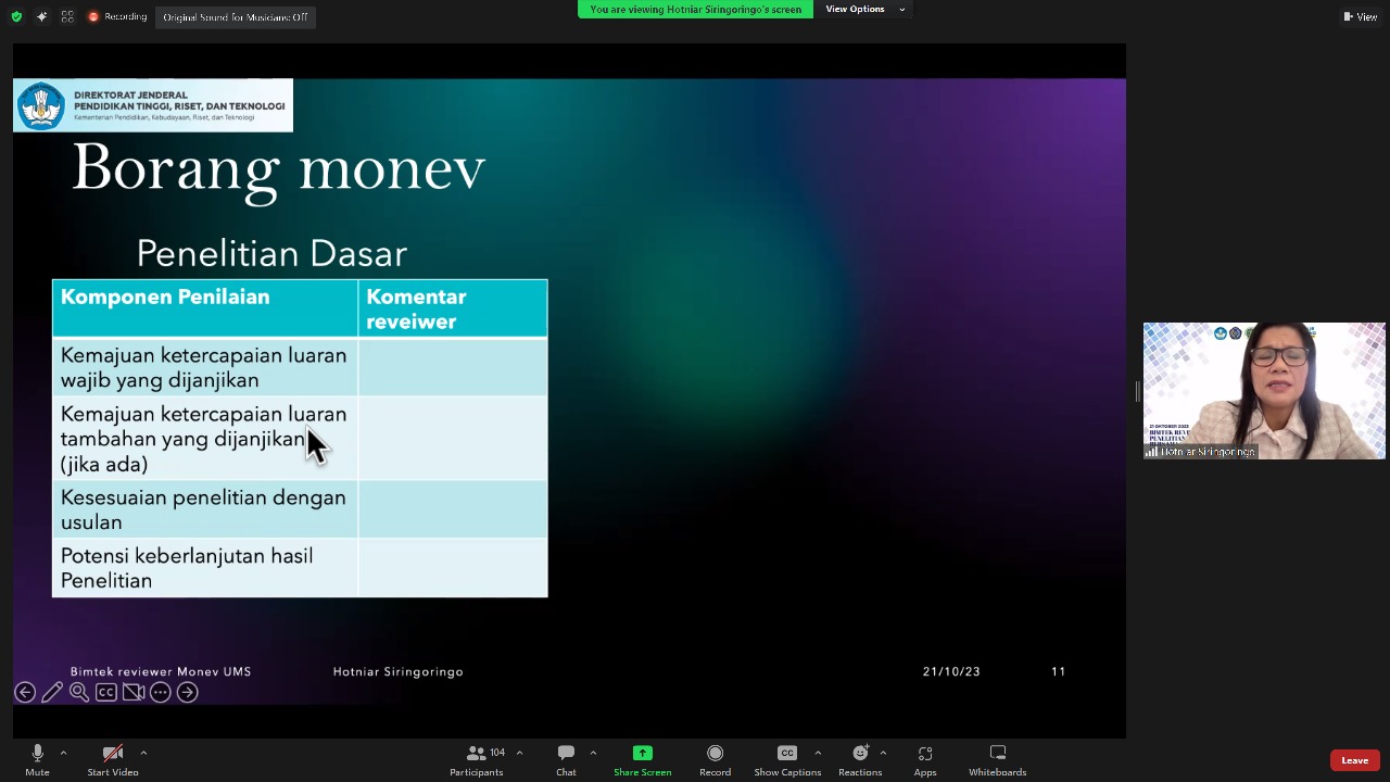 Ia berharap dalam melakukan riview hasil riset, para reviewer dapat menjalankan tugasnya dengan baik serta pada akhir tahun 2023 ini laporan hasil riset bisa berhasil memebuhi target yang telah ditentukan.