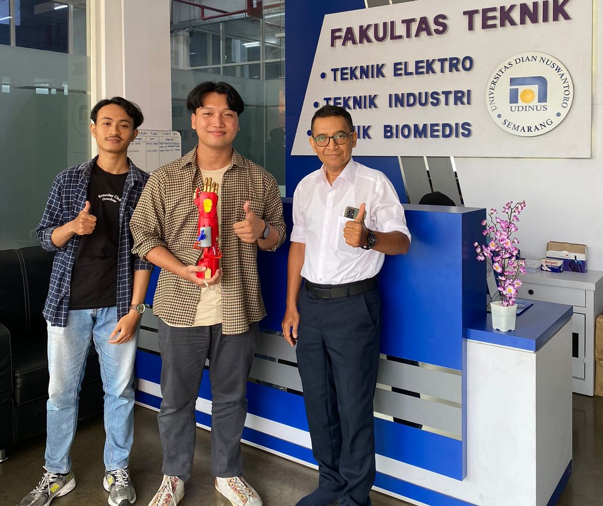 Semarang – Tiga mahasiswa Fakultas Teknik (FT) Universitas Dian Nuswantoro (Udinus) ciptakan tangan prostetik bagi anak difabel. Alat tersebut didesain seperti tangan superhero sebagai cara untuk menambah kepercayaan diri anak-anak. Tangan prostetik yang diberi nama ‘Handsome’ dapat melakukan fungsional menggenggam dengan cara melakukan gerakan fleksi untuk menggenggam. Selain itu, dapat juga melakukan gerakan ekstensi untuk membuka genggaman tangan. Alat tersebut diciptakan oleh Dinara Diaz Pramono, Muhammad Rifqi Hanif Ammrullah dan Widia Aulia Cahyani.