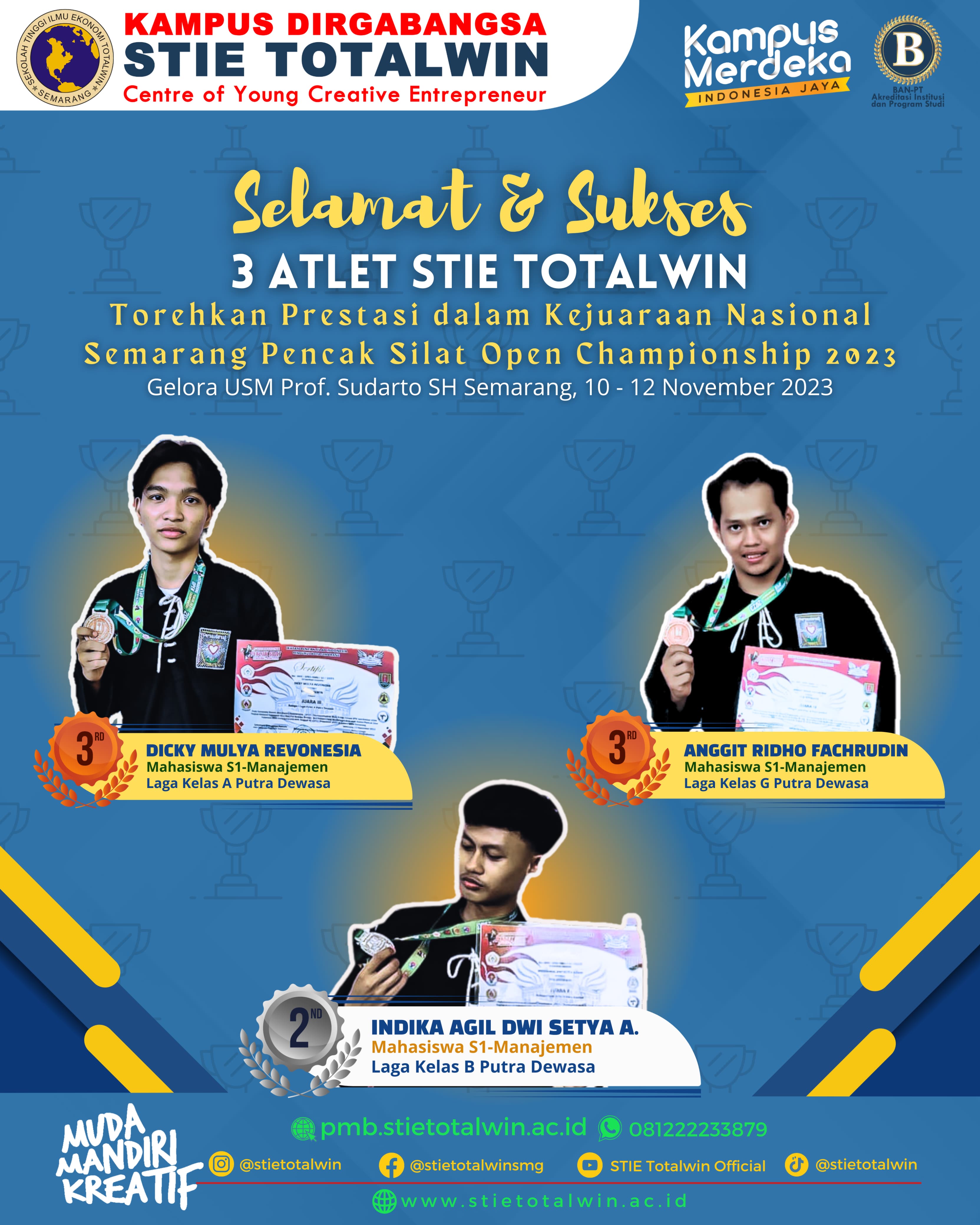 Dan hasilnya, 3 dari 6 delegasi atlet pencak silat Dirgabangsa STIE Totalwin berhasil meraih Juara pada ajang Kejuaraan Nasional SPOC 2023 tersebut, yaitu: