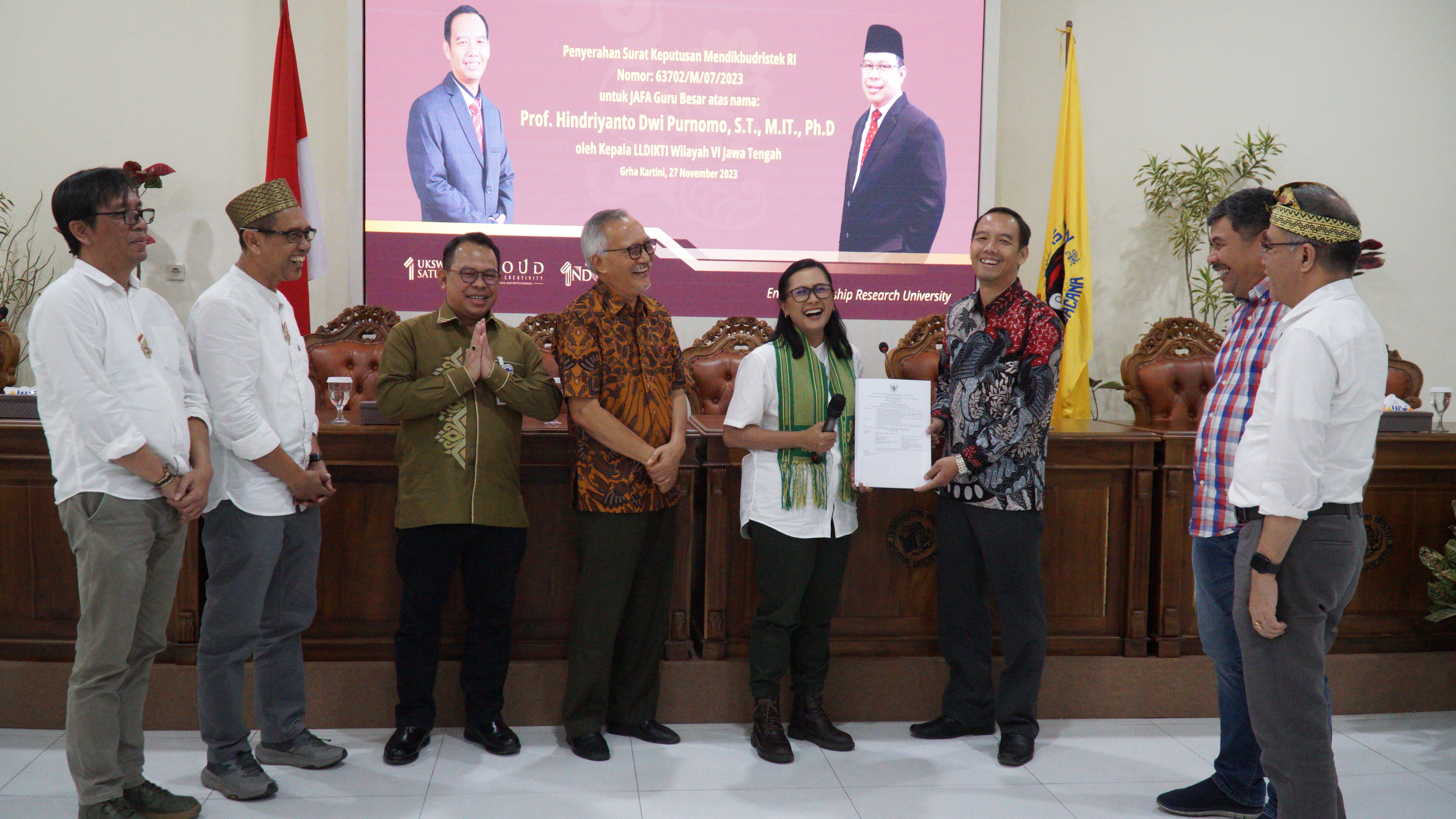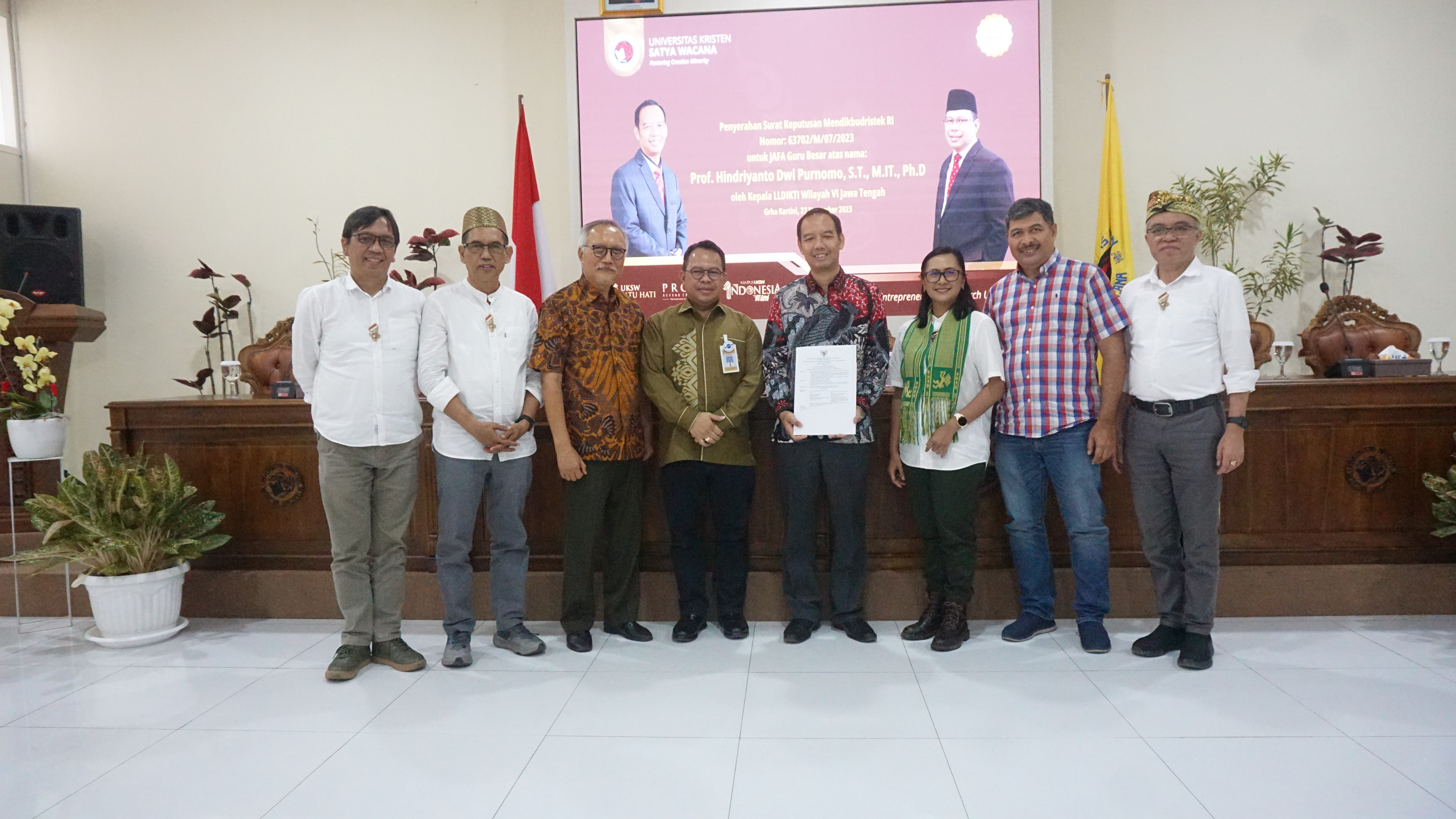 Kepala Lembaga Layanan Pendidikan Tinggi (LLDIKTI) Wilayah VI Bhimo Widyo Andoko, S.H., M.H., menyerahkan secara langsung SK tersebut kepada Ketua Pengurus Yayasan Perguruan Tinggi Kristen Satya Wacana (YPTKSW), Drs. M.Z. Ichsanudin, M.M. Selanjutnya, oleh Ketua Pengurus YPTKSW, SK diserahkan kepada Rektor UKSW Prof. Intiyas Utami, S.E., M.Si., Ak., yang kemudian diterima langsung oleh Prof. Hindriyanto Dwi Purnomo, S.T., M.IT., Ph.D.