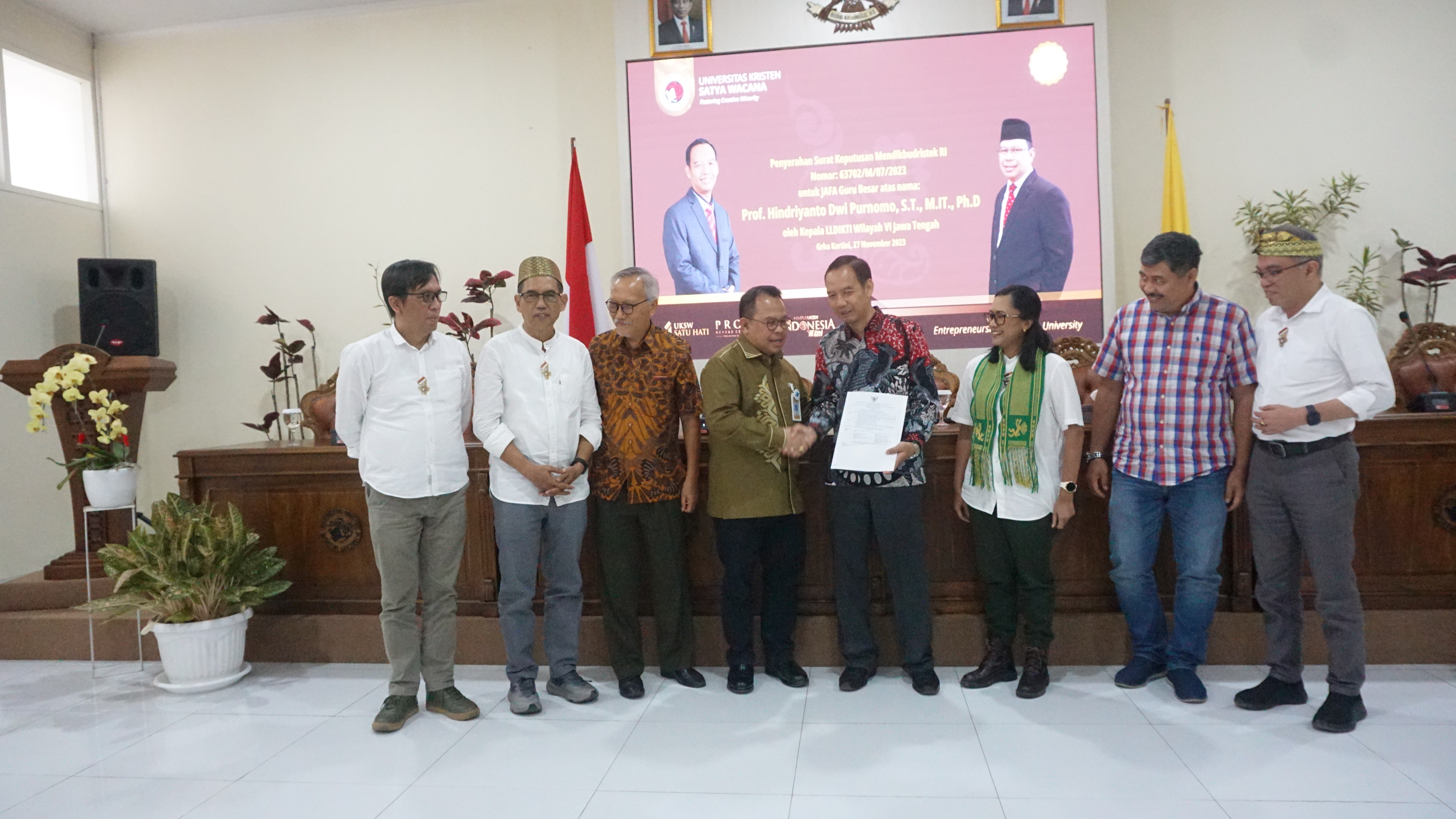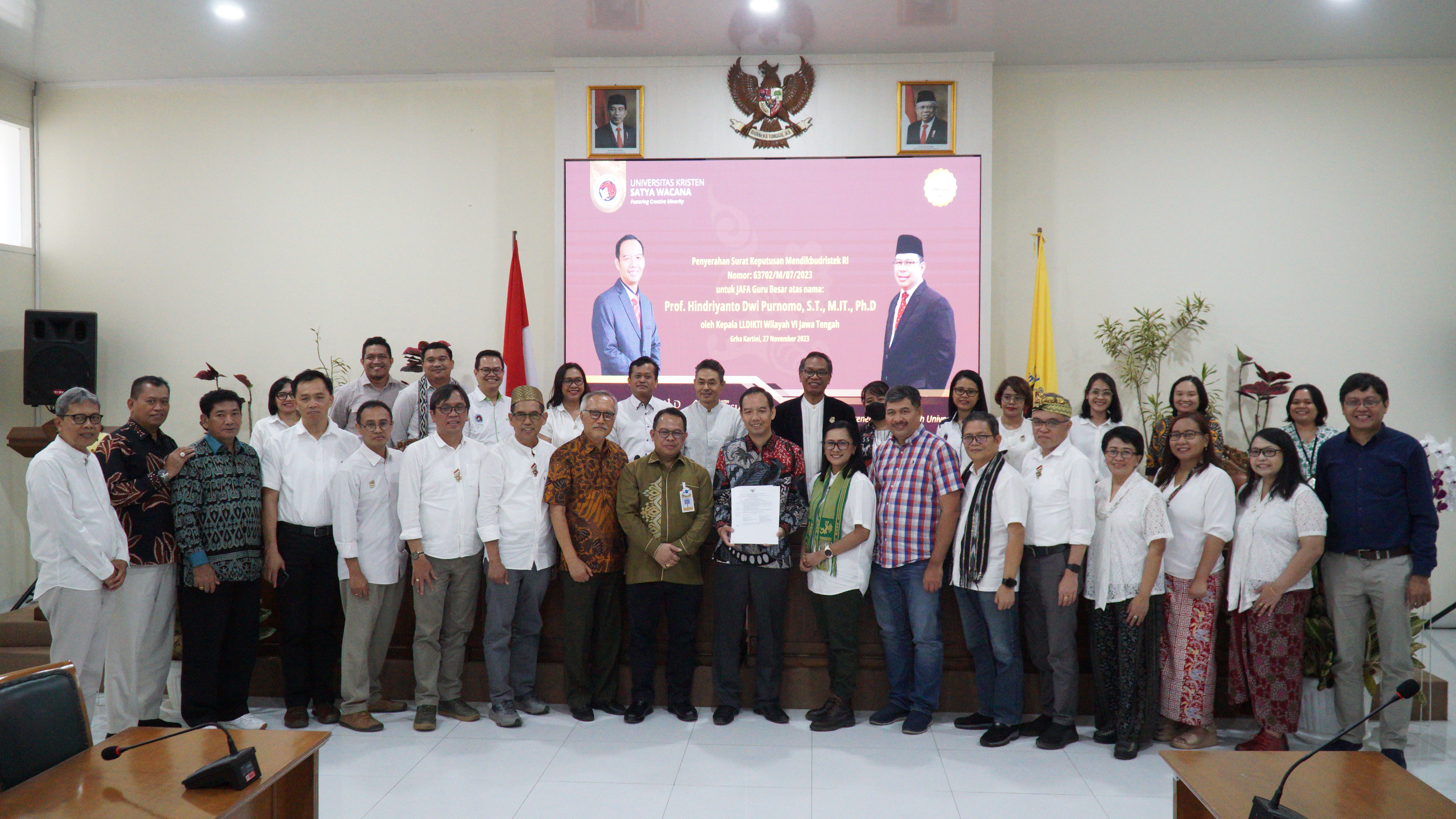 Salatiga – Satu lagi kabar gembira diperoleh Universitas Kristen Satya Wacana (UKSW) menjelang peringatan Dies Natalisnya yang ke-67 dengan lahirnya satu Guru Besar baru. Jabatan Fungsional Akademik (JAFA) Guru Besar diperoleh Prof. Hindriyanto Dwi Purnomo, S.T., M.IT., Ph.D., yang adalah Dosen Fakultas Teknologi Informasi (FTI). Surat Keputusan Kementerian Pendidikan, Kebudayaan, Riset, dan Teknologi (Kemendikbud Ristek) No 63702/M/07/2023 tentang kenaikan JAFA Guru Besar dalam Bidang Ilmu Teknik Elektronika dan Informatika diterima Prof. Hindriyanto Dwi Purnomo, S.T., M.IT., Ph.D., Senin (27/11/2023) sore di Ruang Rapat Kartini, Grha Kartini.