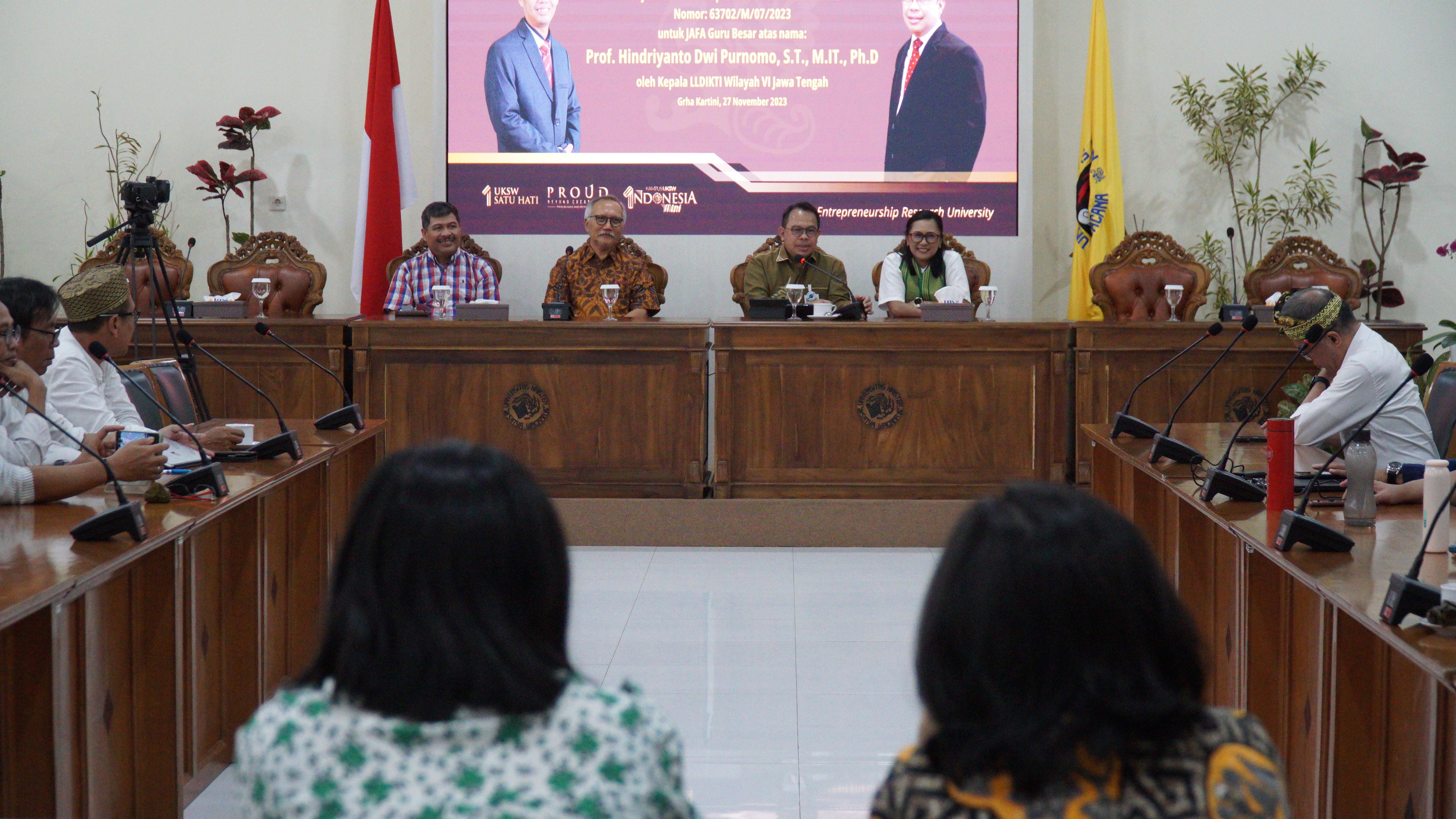 Sementara itu, Kepala LLDIKTI Wilayah VI memberikan apresiasi adanya guyub yang baik antara YPTKSW dan UKSW sehingga ada hasil Guru Besar lagi. “Selamat tentunya untuk Profesor Hindriyanto, semoga bisa menjadi model atau contoh bagi dosen muda lainnya untuk berprestasi. Selain itu juga bisa terus memberikan kontribusi yang baik untuk kemajuan dan mutu UKSW, LLDIKTI VI dan juga keluarga,” kata Kepala LLDIKTI Wilayah VI. Dalam kesempatan ini, Bhimo Widyo Andoko, S.H., M.H., juga menekankan bahwa untuk mencapai JAFA Guru Besar tidaklah sulit, jika dosen memiliki inovasi dan juga semangat.
