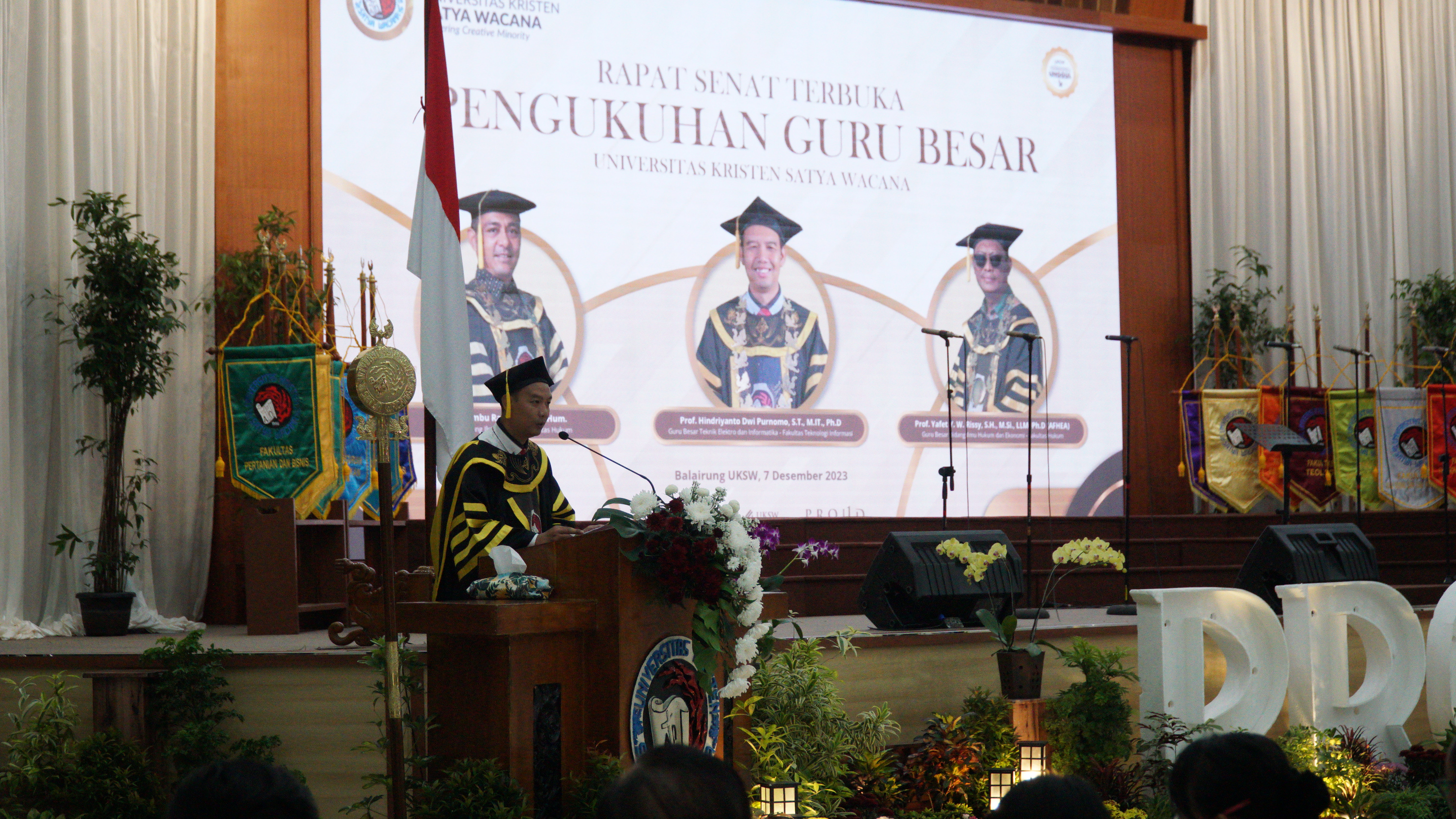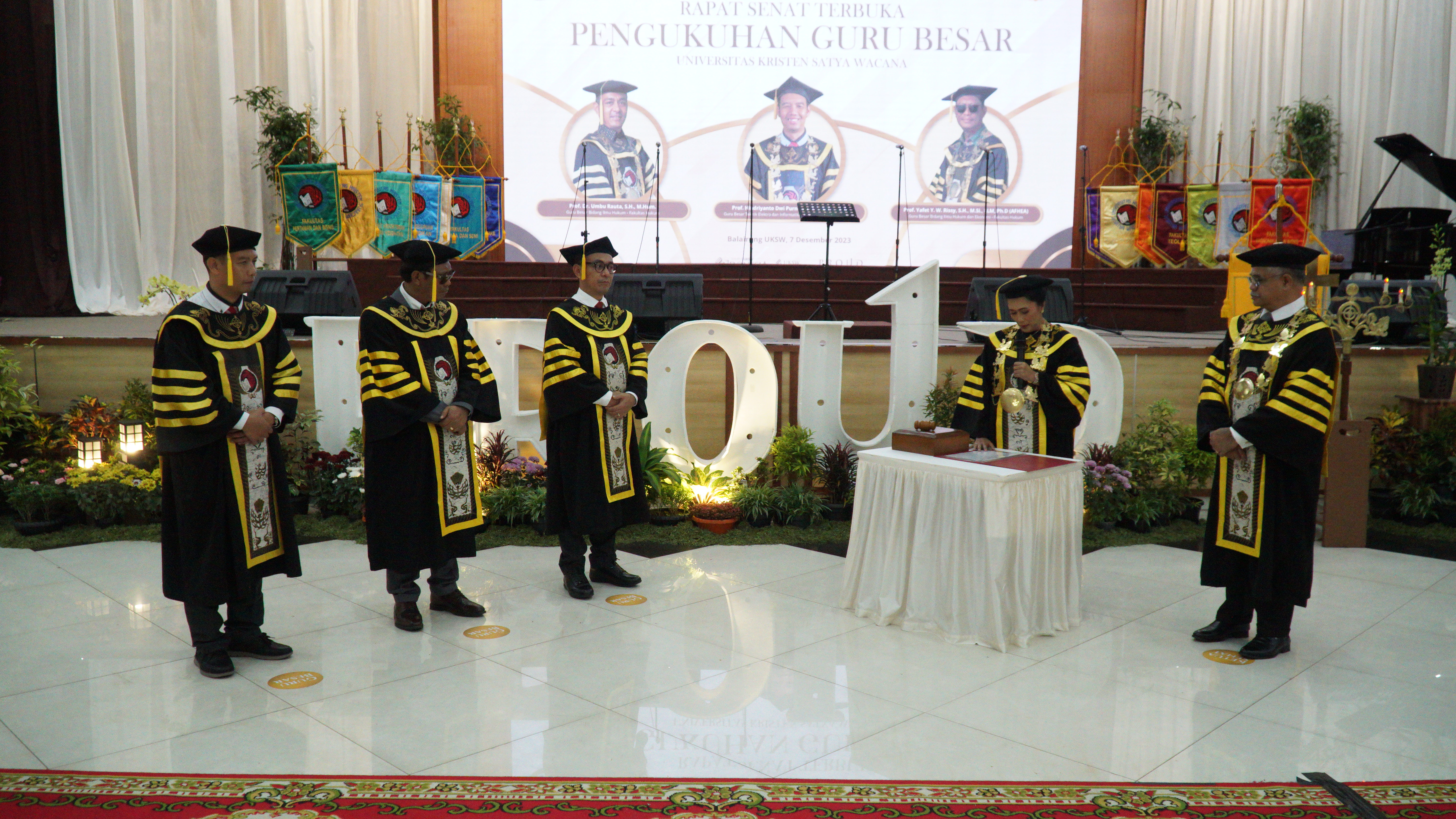 Tiga Guru Besar dikukuhkan oleh Rektor Universitas Kristen Satya Wacana (UKSW) Prof. Dr. Intiyas Utami, S.E., M.Si., Ak., Kamis (7/12/2023). Pengukuhan ditandai dengan pembacaan Surat Keputusan oleh Rektor Intiyas dan dilanjutkan dengan penyematan kalung senator oleh Ketua Senat UKSW Prof. Daniel Daud Kameo, S.E., M.A., Ph.D.