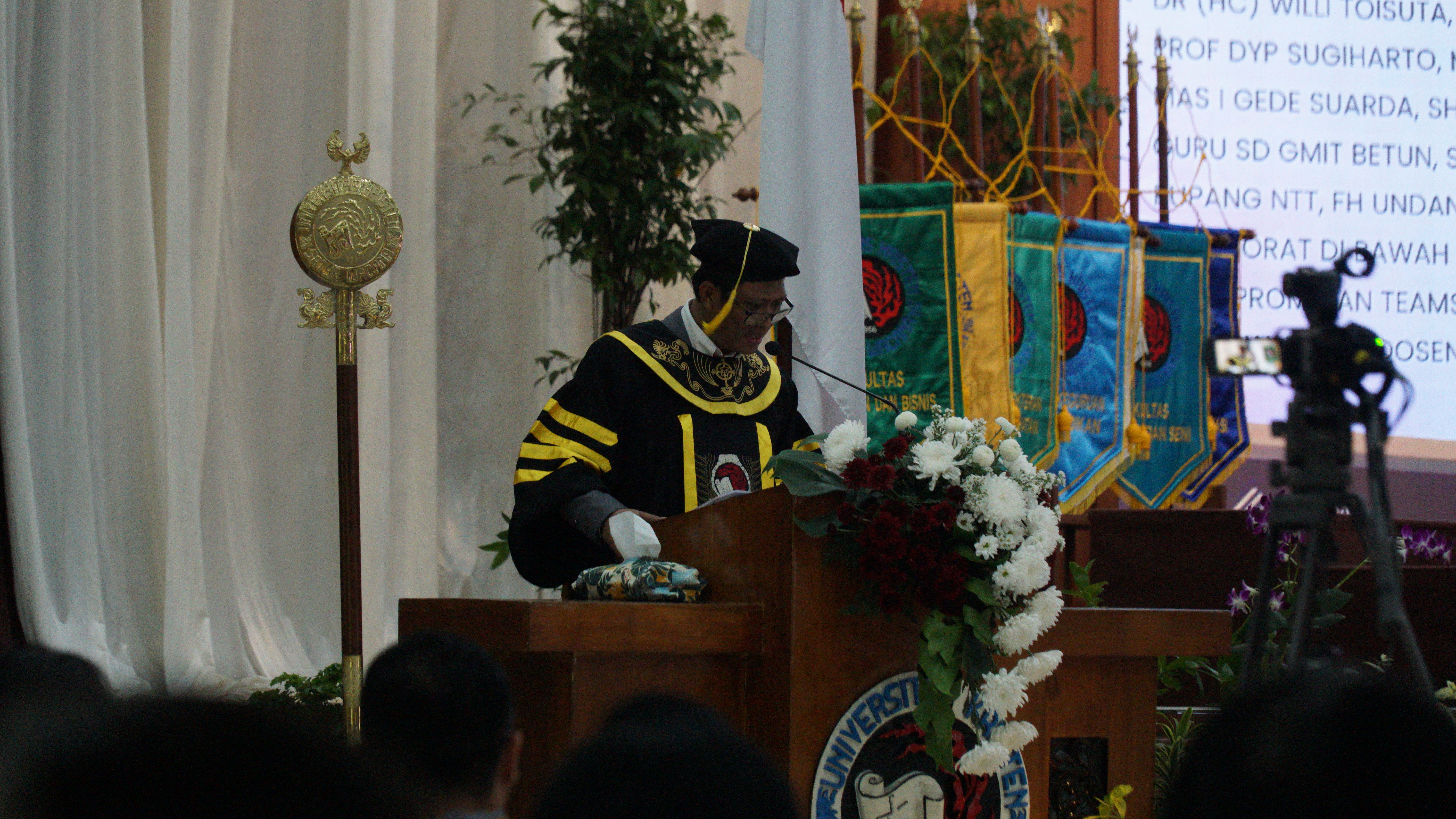 Prof. Dr. Umbu Rauta, S.H., M.Hum., menyampaikan pidato ilmiah berjudul “Konstitusionalitas Ibu Kota Negara dalam Desain Hubungan Pusat Daerah Menurut UUD 1945”. Memulai perjalanan 52 tahun lalu lahir di Kabonduk pada 1 September 1971, ia mengawali kiprahnya sebagai dosen di FH UKSW pada tahun 1995.