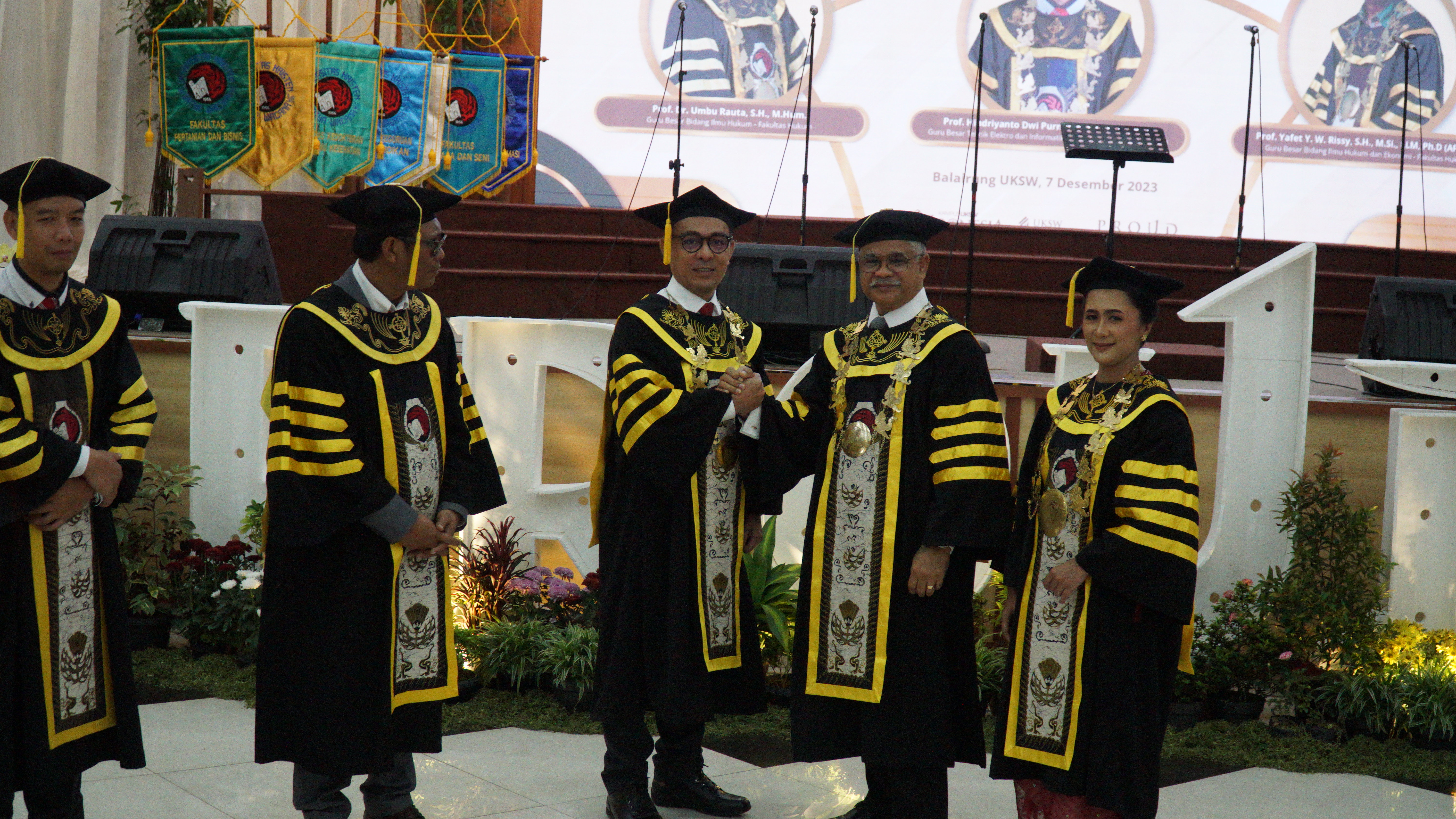 Prof. Yafet Yosafet Rissy, S.H., M.Si., Ph.D., LLM (AFHEA)., menyampaikan pidato ilmiah berjudul “Analisis Ekonomi Terhadap Hukum Paten di Indonesia”. Lahir di Kota Betun Malaka Nusa Tenggara Timur (NTT), ia memulai kiprahnya sebagai pengajar di FH UKSW pada 2002.