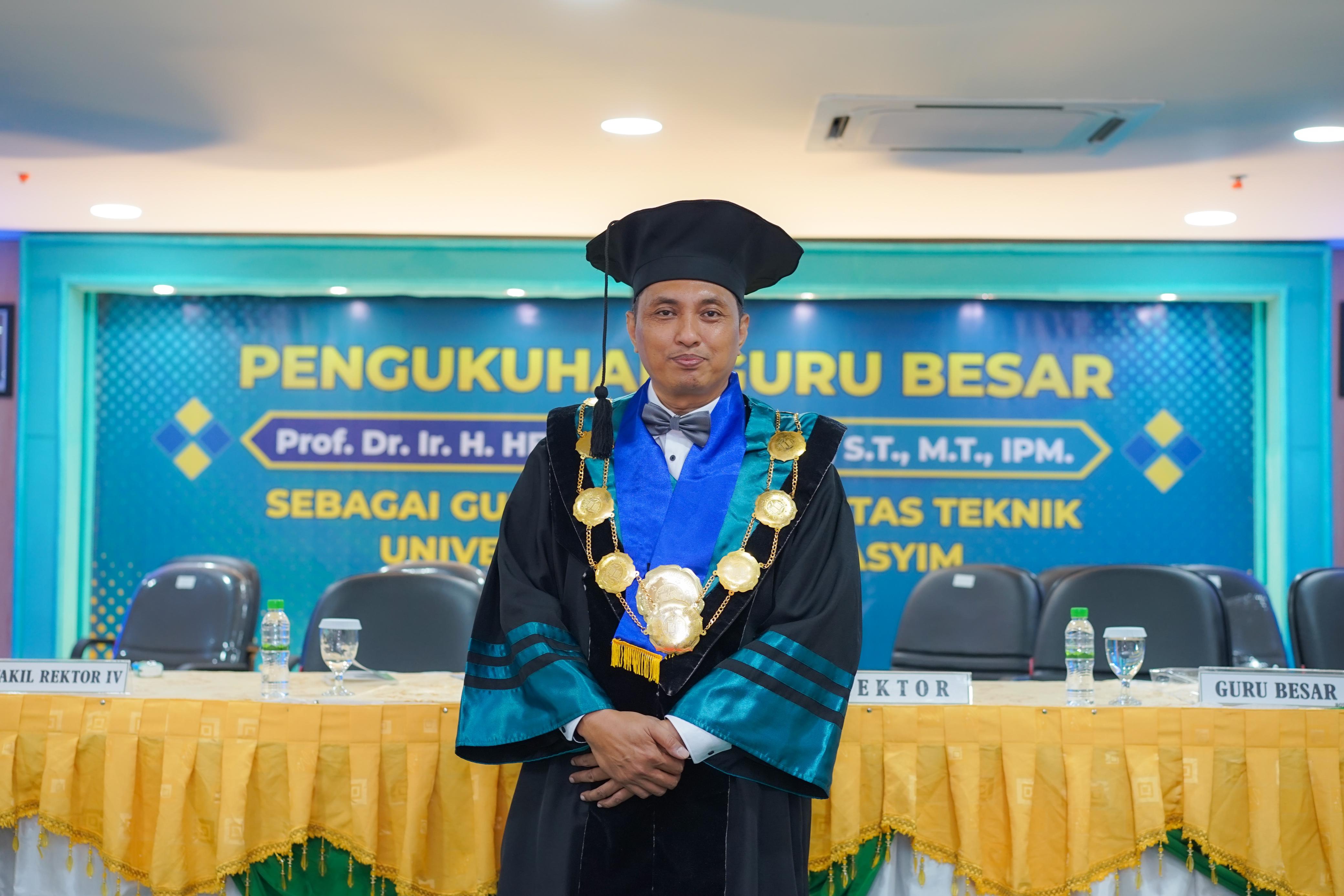 Pada kesempatan ini Prof Helmy sebagai Guru Besar yang dikukuhkan mendapatkan kesempatan untuk menyampaikan orasi ilmiahnya dengan judul Pengembangan Material Tahan Balistik untuk Kemandirian Bangsa dalam Bidang Pertahanan dan Keamanan. Beliau menyampaikan jika baja telah tertuang dalam Al Quran dimana baja merupakan material yang kuat dan dapat dikuatkan melalui pemanasan “baja digunakan sebagai bahan untuk melindungi diri dari ancaman musuh, dalam ilmu meltalurgi modern, baja masih digunakan sebagai bahan utama dalam pembuatan bahan tahan balistik” jelasnya. Ia menambahkan jika dinamika geopolitik dan komplektitas ancama keamanan bangsa Indonesia menjadi salah satu dasar ilmu yang Ia pelajari “ancaman pertahanan keamanan bangsa Indonesia menjadi satu hal yang penting karena kita dikelilingi negara maju dan negara yang sedang berkonflik baik secara politik maupun secara ekonomi. Juga karena letak Indonesia yang strategis dengan Sumber Daya Alam (SDA) yang melimpah” pungkasnya.