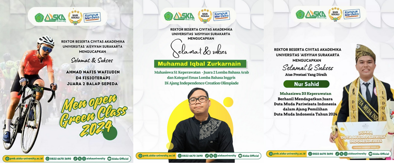 Surakarta – Tiga mahasiswa Universitas ‘Aisyiyah Surakarta (Aiska University) berhasil mengharumkan nama almamater dengan meraih juara di tiga lomba berbeda tingkat nasional. Prestasi ini tidak hanya menjadi kebanggaan bagi Aiska University, tetapi juga menjadi bukti nyata kualitas pendidikan yang diberikan oleh Universitas. Berikut ini daftar para juara: