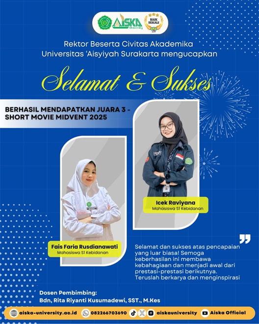 Surakarta (8/7) — Universitas ‘Aisyiyah Surakarta kembali menorehkan prestasi membanggakan di kancah nasional. Mahasiswa Program Studi S1 Kebidanan berhasil meraih juara dalam ajang MIDVENT 2025, sebuah kompetisi yang mengasah kreativitas dan kemampuan mahasiswa dalam bidang media dan visual digital.