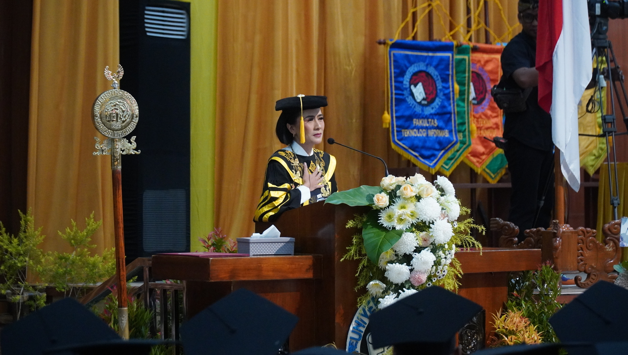 Upacara Wisuda Periode III ini dipimpin oleh Ketua Senat UKSW Profesor Apriani Dorkas Rambu Atahau, S.E., M.Com., Ph.D. Selain Senator UKSW, momen wisuda kali ini juga turut dihadiri Bendahara Pengurus Yayasan Perguruan Tinggi Kristen Satya Wacana (YPTKSW) Rina Rahmawati dan Ketua Bagian Patologi Anatomi Fakultas Kedokteran Universitas Sam Ratulangi Manado Dr. Carla Felly Kairupan.