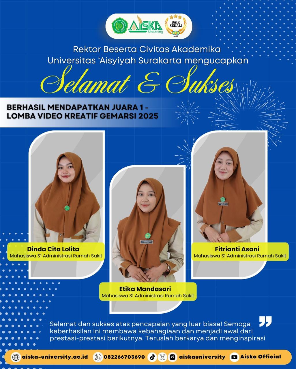 Ketiganya merupakan mahasiswa aktif Prodi S1 Administrasi Rumah Sakit Aiska University yang menunjukkan kreativitas dan inovasi luar biasa dalam menyampaikan pesan edukatif melalui media video. Karya mereka berhasil menyisihkan banyak peserta dari berbagai perguruan tinggi lainnya di tingkat nasional.