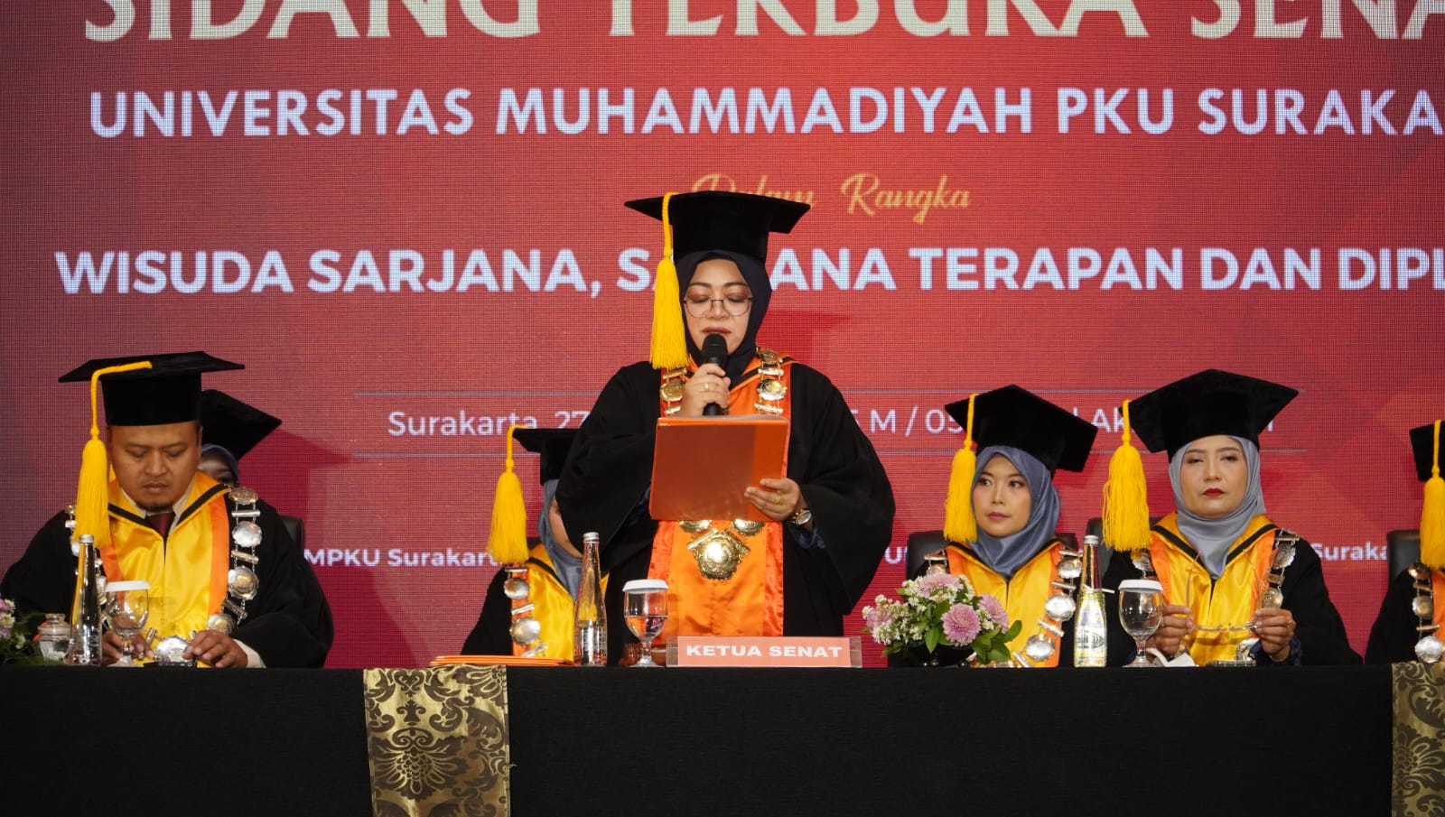 Rektor UM PKU Surakarta, Weni Hastuti S.Kep., M.Kes., Ph. D., menyampaikan hari itu merupakan upacara wisuda perdana di UM PKU Surakarta pada periode September 2025. Diketahui, pada Februari 2025 kemarin, ITS PKU Muhammadiyah Surakarta telah bertransformasi menjadi UM PKU pada Februari 2025.