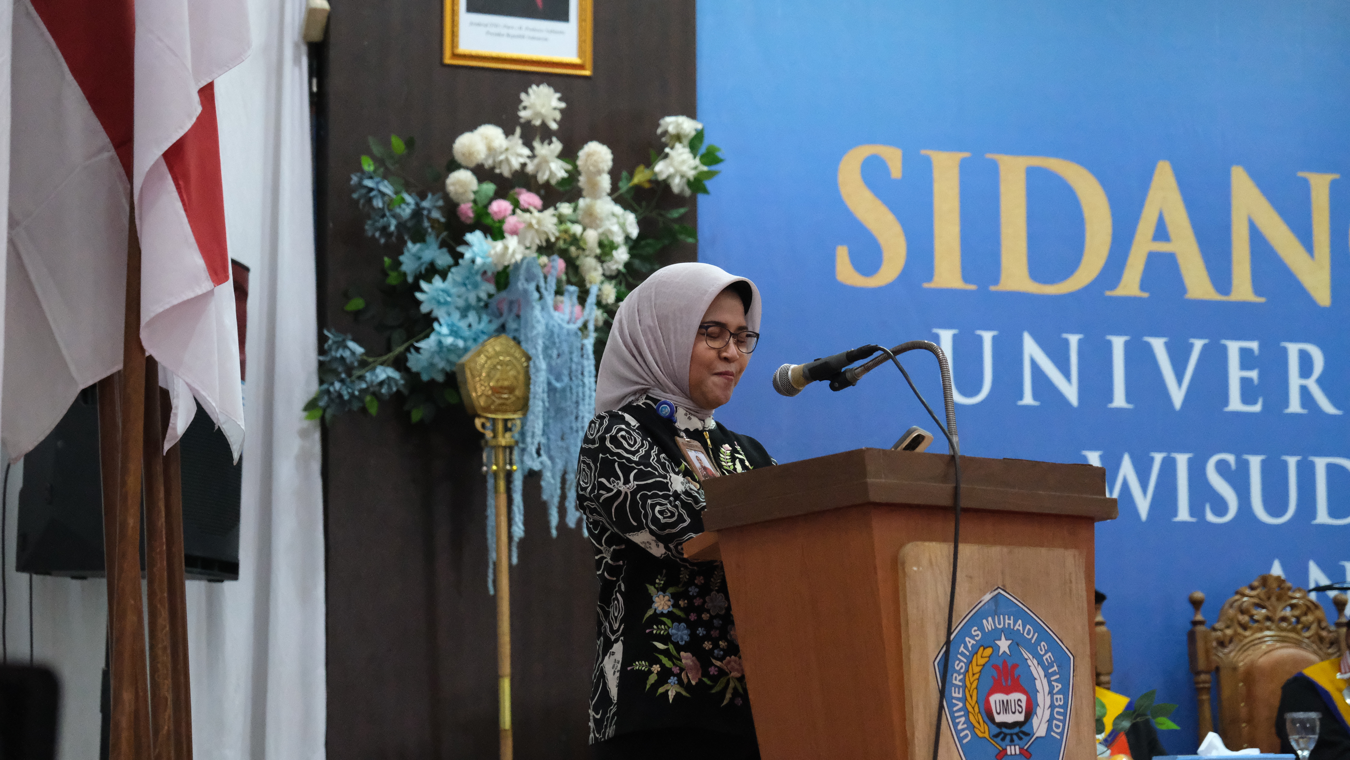 Kehadiran Kepala LLDIKTI Wilayah VI kali ini tidak hanya memberikan sambutan melainkan juga memberikan orasi ilmiah bertema “Wisudawan Indonesia: Talenta Global untuk Peradaban.”. Dalam orasi ilmiahnya, Prof. Aisyah menyampaikan pentingnya peran lulusan perguruan tinggi dalam menghadapi tantangan global yang terus berkembang. Beliau menekankan bahwa para wisudawan harus memiliki daya saing internasional tanpa melupakan nilai-nilai luhur bangsa. Menurutnya, lulusan UMUS diharapkan tidak hanya menjadi pencari kerja, tetapi juga pencipta perubahan dan pembawa kemajuan bagi masyarakat.