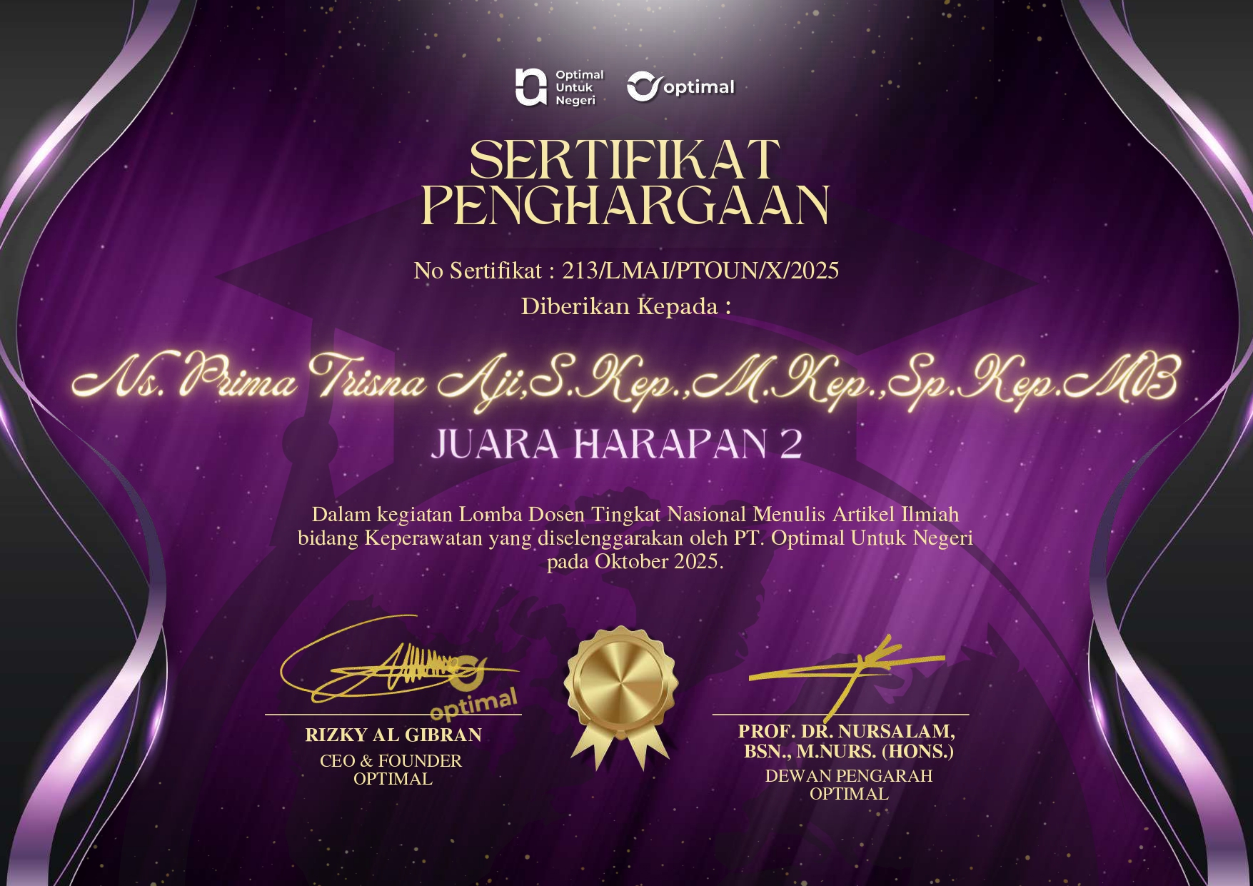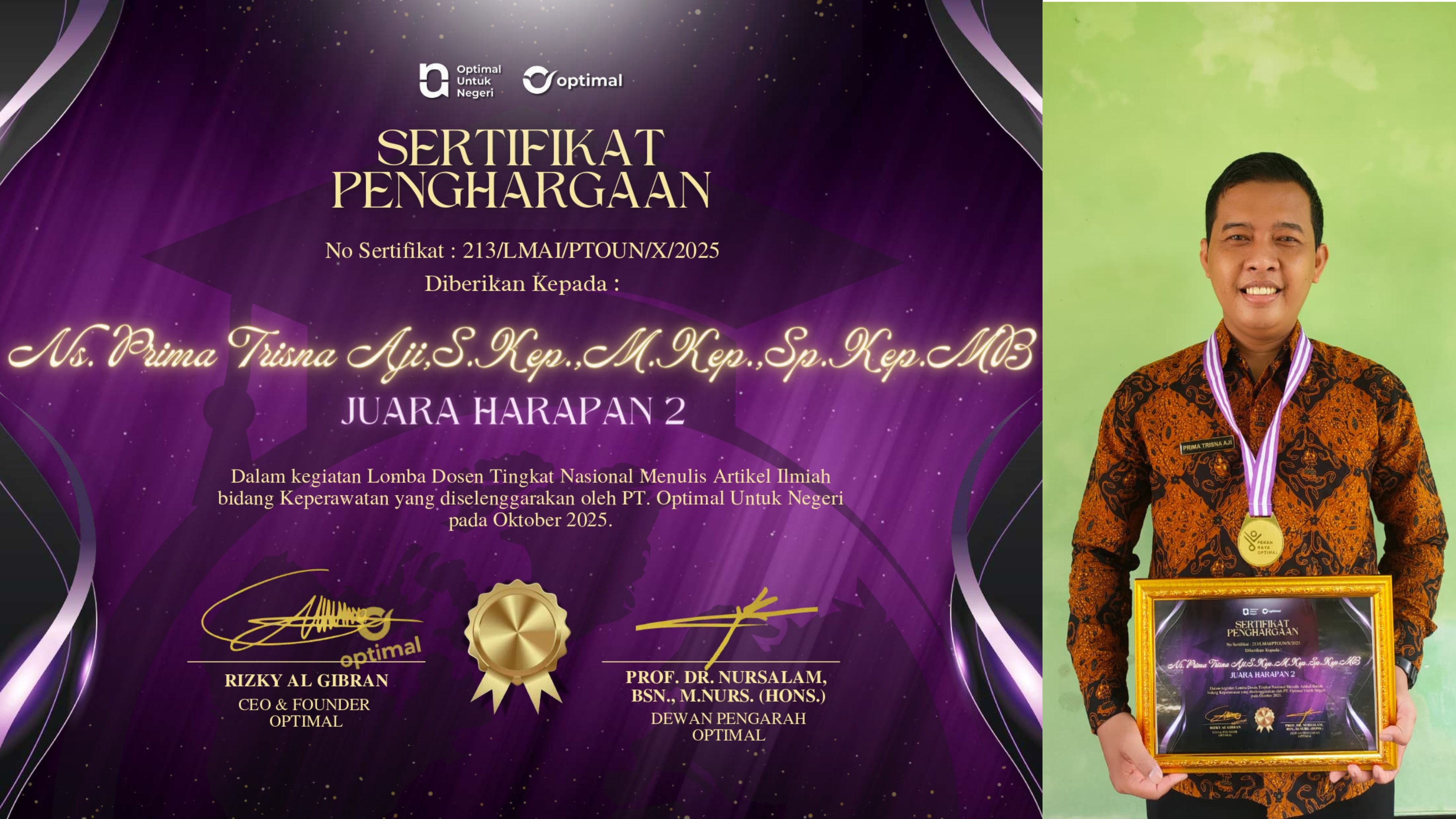 Semarang – Prestasi gemilang kembali ditorehkan oleh Universitas Muhammadiyah Semarang (UNIMUS) di kancah nasional. Dosen Program Studi Spesialis Keperawatan Medikal Bedah, Prima Trisna Aji berhasil meraih Juara Harapan II dalam ajang Lomba Menulis Artikel Ilmiah Dosen Tingkat Nasional yang diselenggarakan oleh PT Optimal Untuk Negeri (OPTIMAL) pada bulan November 2025 bersama anggota yang lain dosen prodi Spesialis Medikal Bedah Unimus Semarang yaitu Doktor Yuni Armiati dan Arief Sofyan Baidhowy.